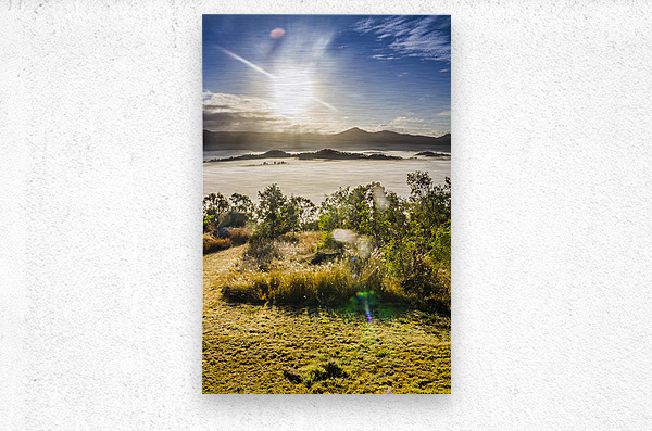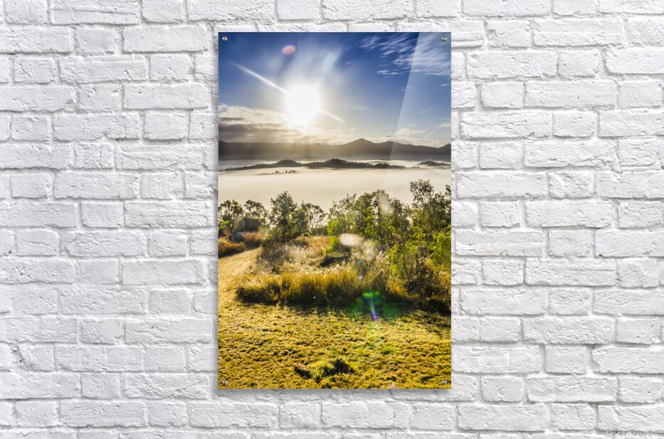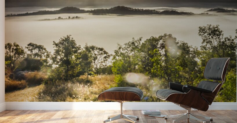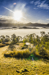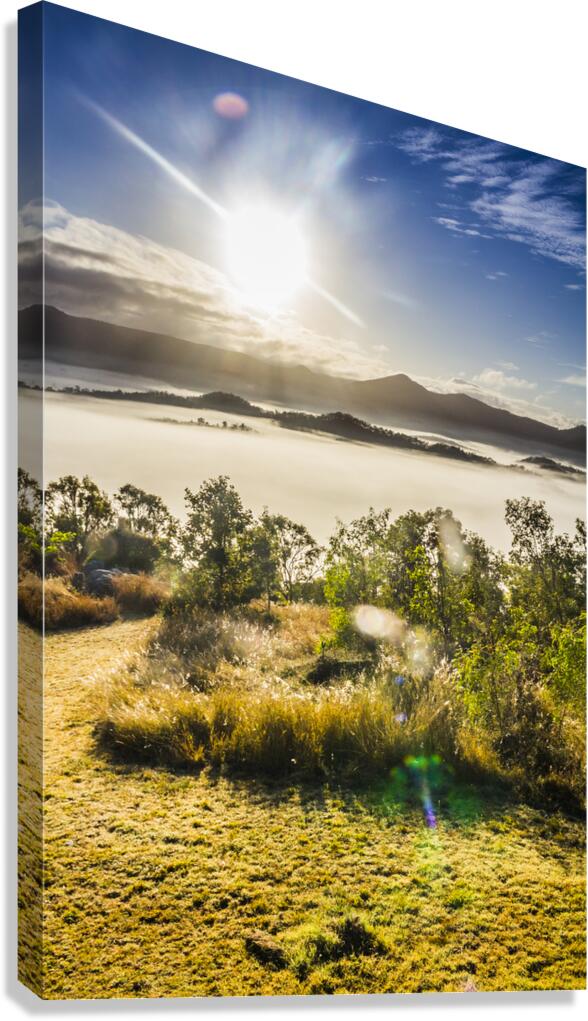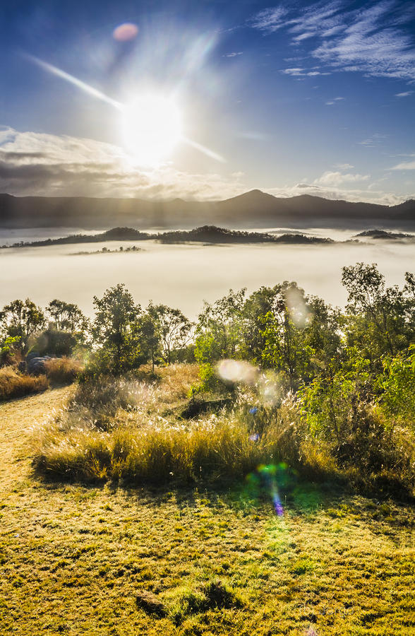 Wonder-filled landscape of mountainous mist and morning sunshine beaming with lenflares and tranquility. Mount Perry Queensland Australia