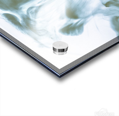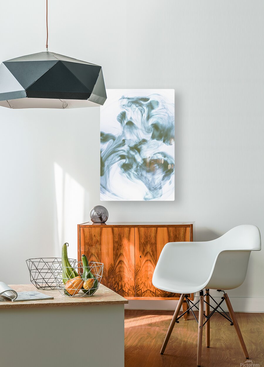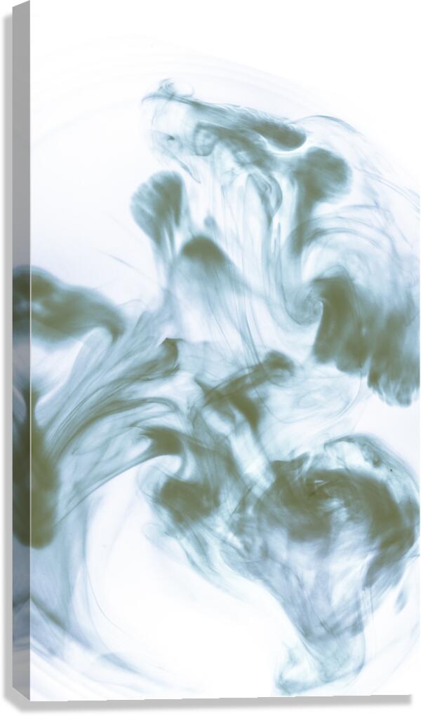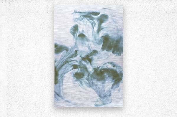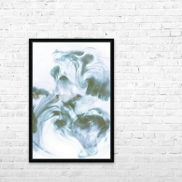 In a liquid esque abstract a swash of smoky grey and blue intermix on white in dramatic tonal abstract. Photography created with food dye water and mi...[+]