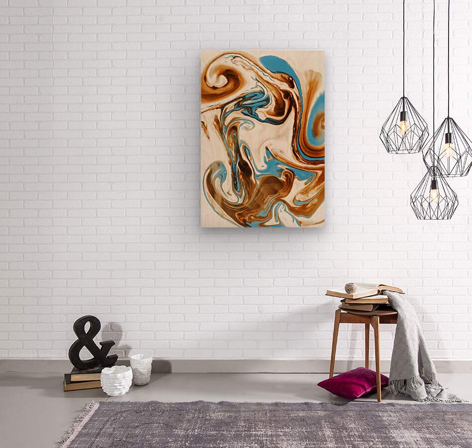 A free form frolic in painterly abstract with twirls and curles of turquoise and brown marbleised in a merger and individual coalescence. Photographic abastract art created utilising food coloring milk and water