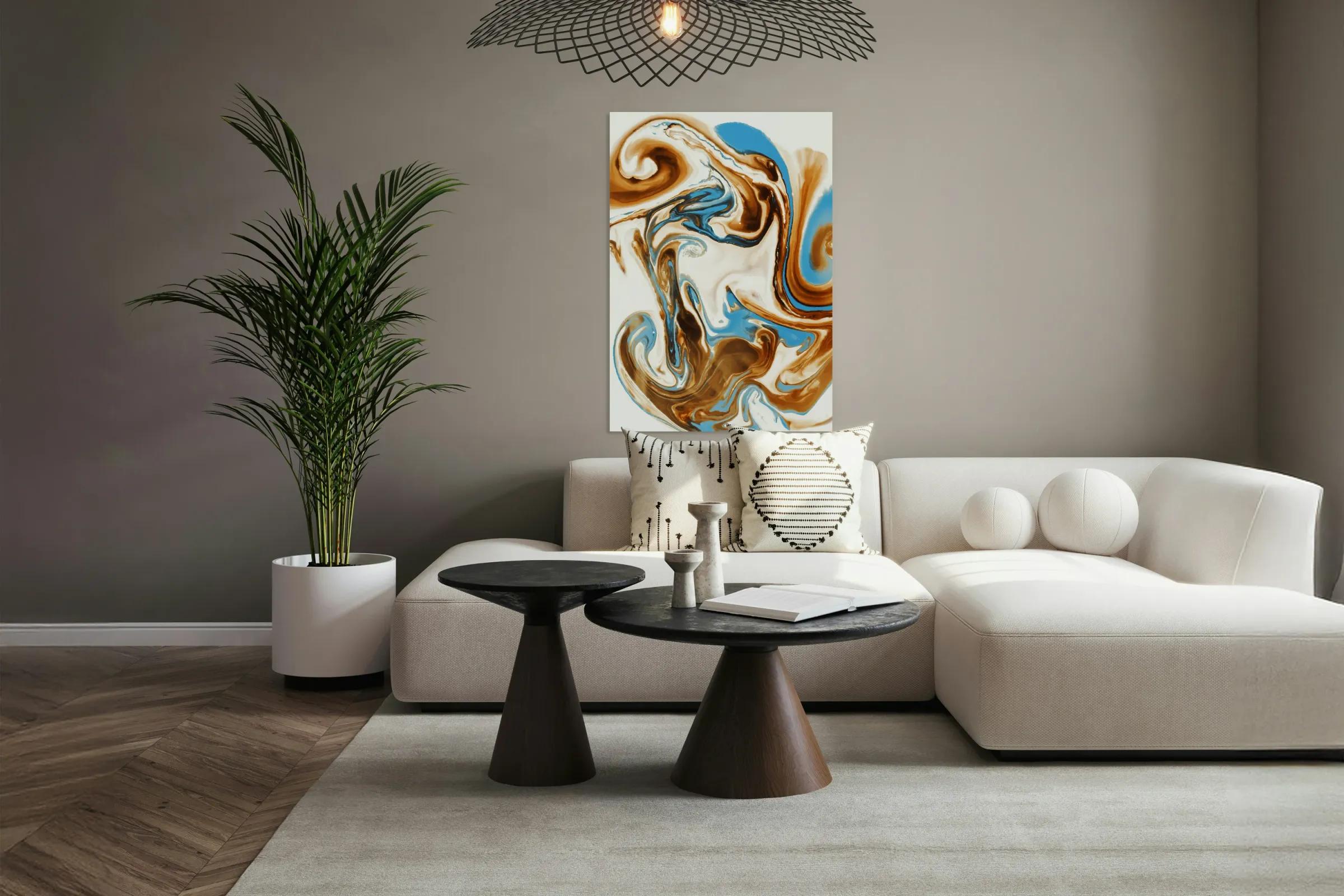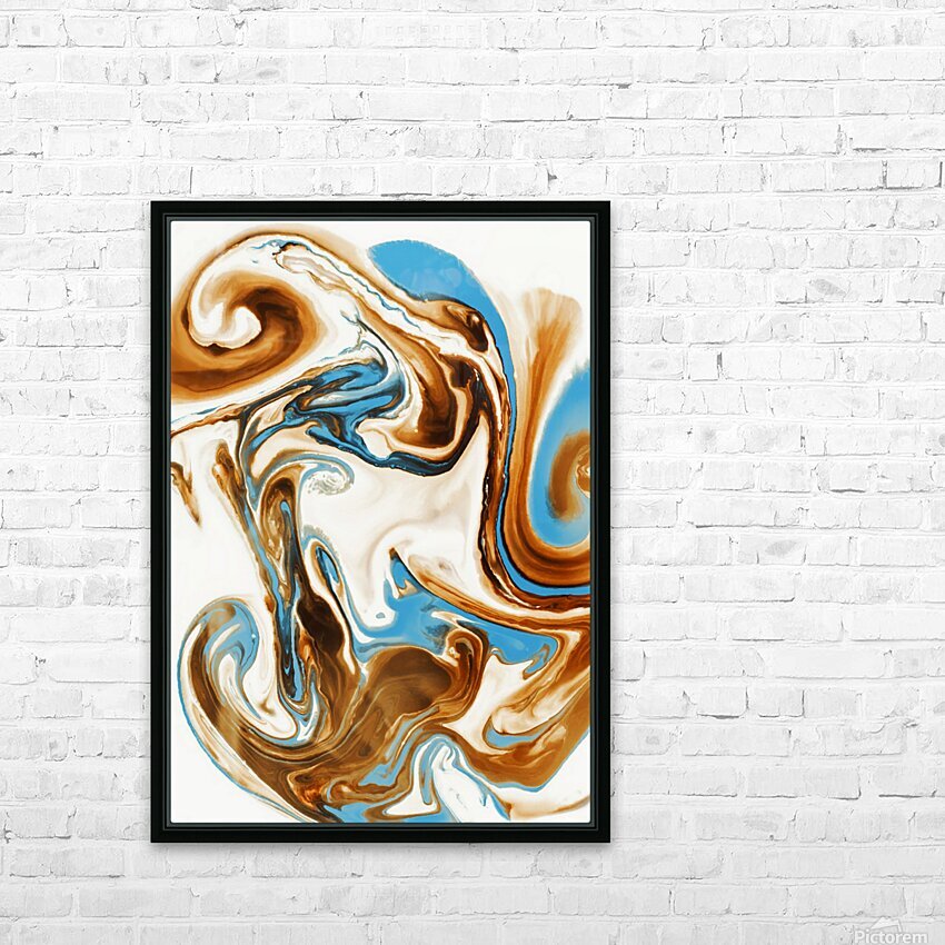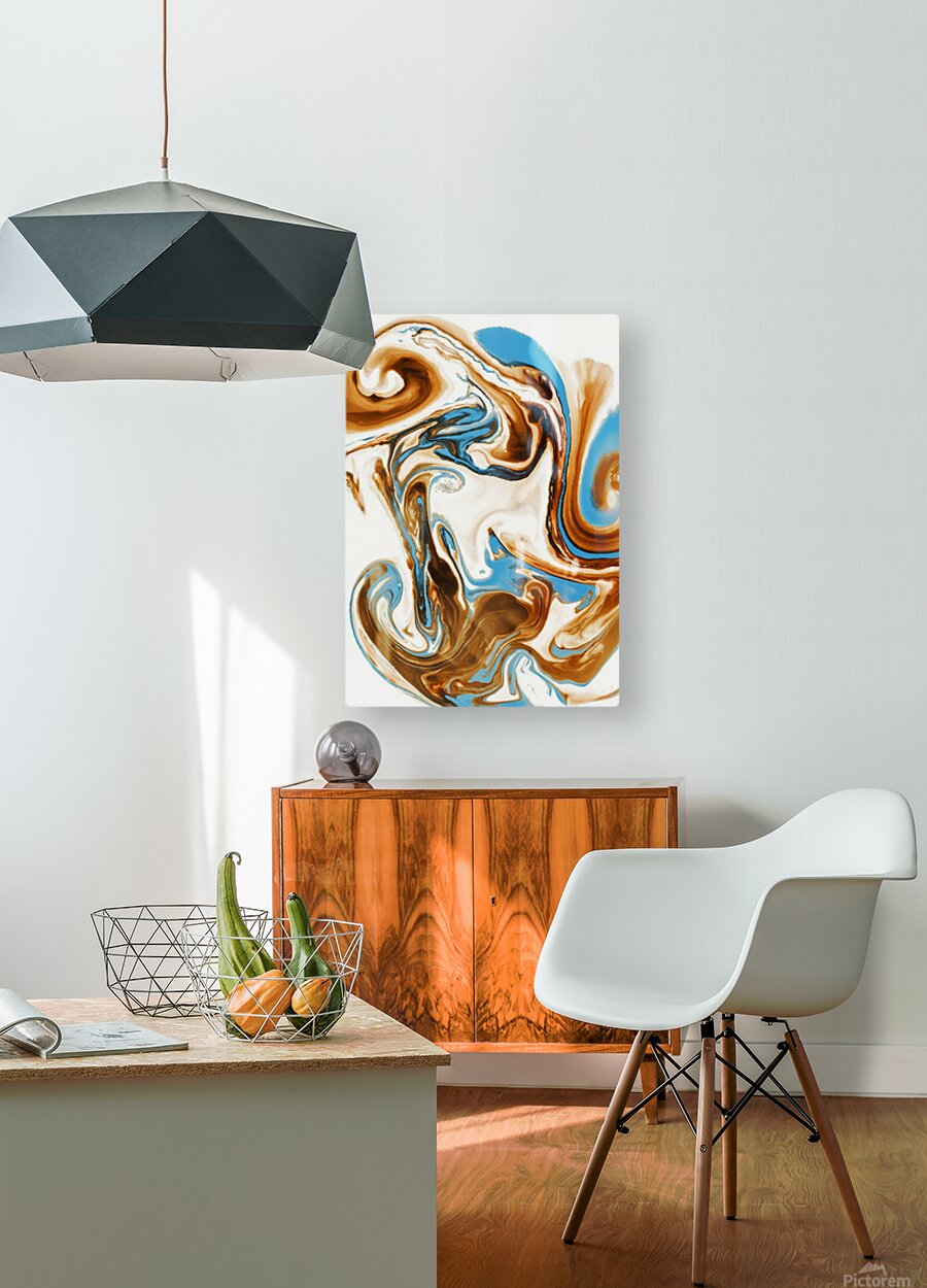 A free form frolic in painterly abstract with twirls and curles of turquoise and brown marbleised in a merger and individual coalescence. Photographic...[+]
