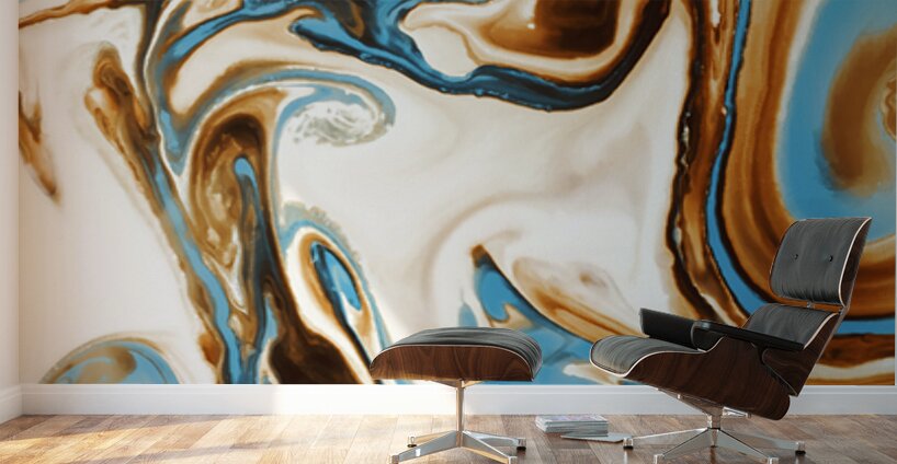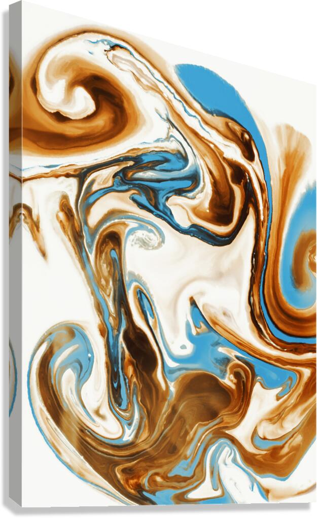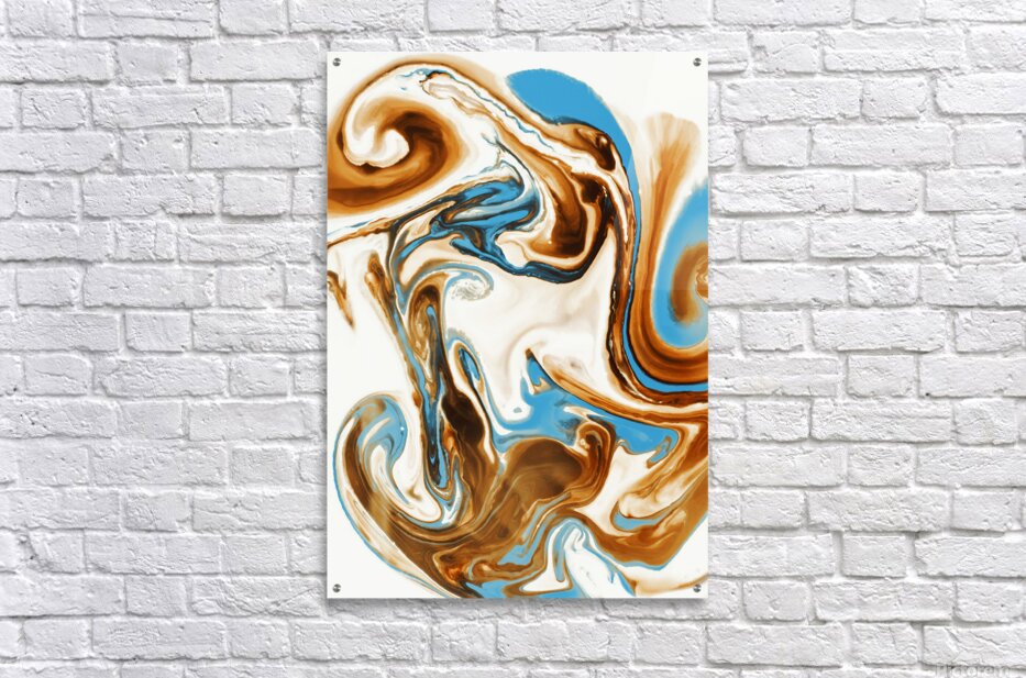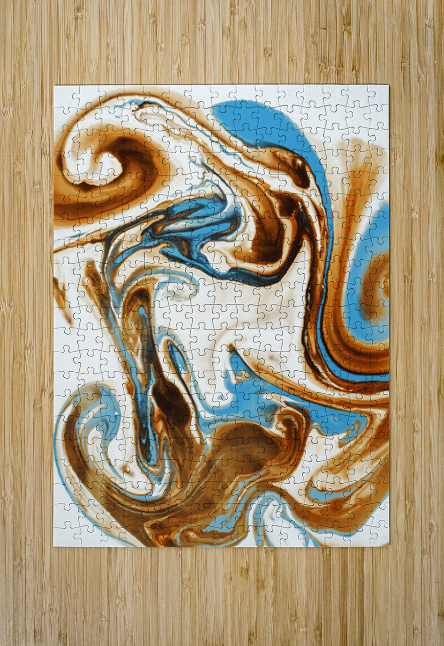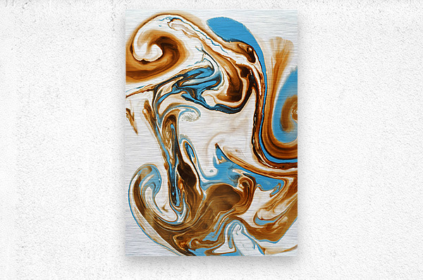 A free form frolic in painterly abstract with twirls and curles of turquoise and brown marbleised in a merger and individual coalescence. Photographic abastract art created utilising food coloring milk and water