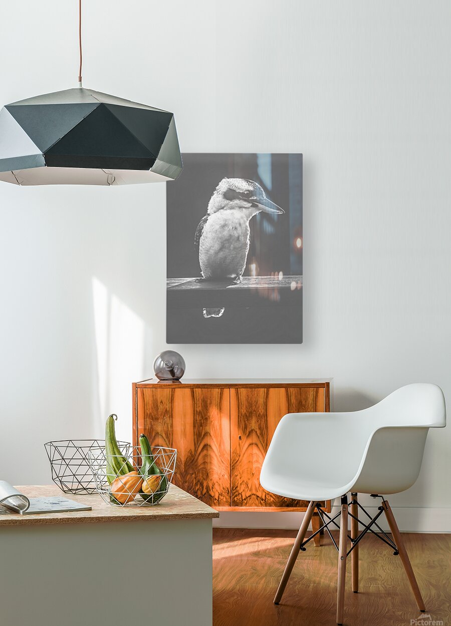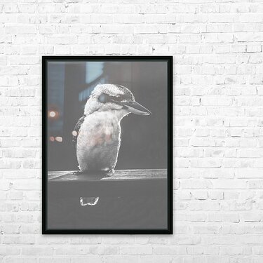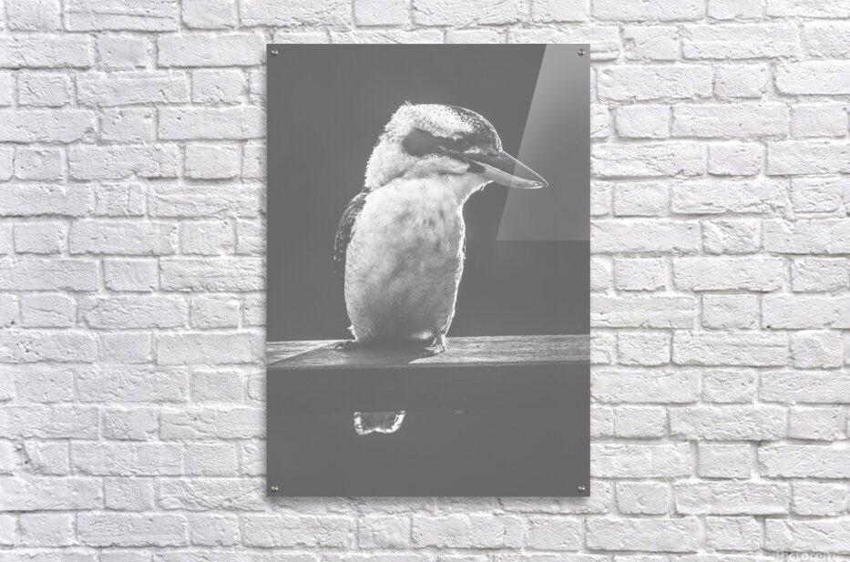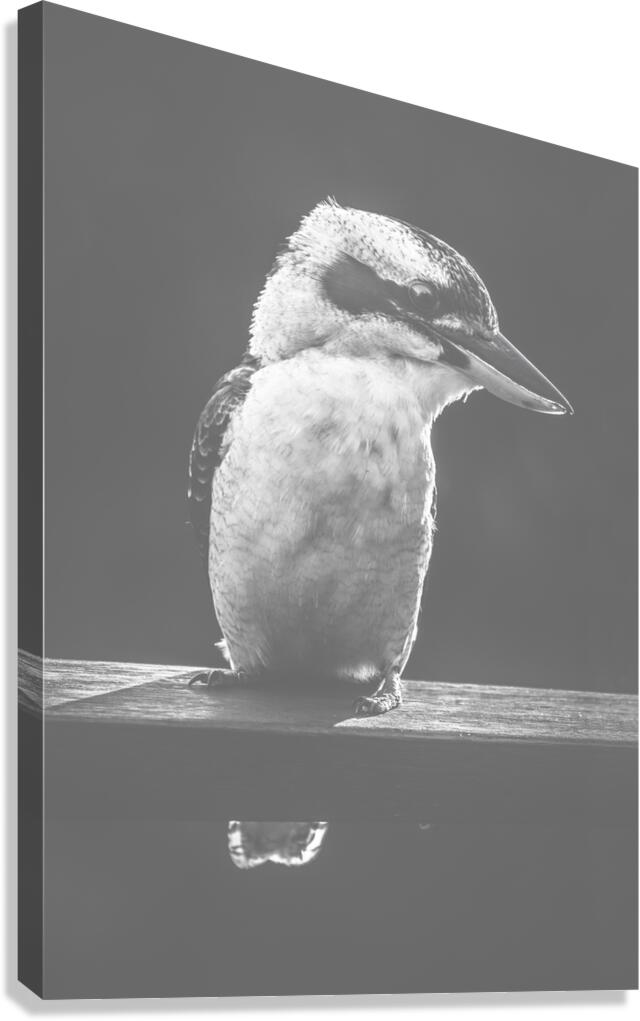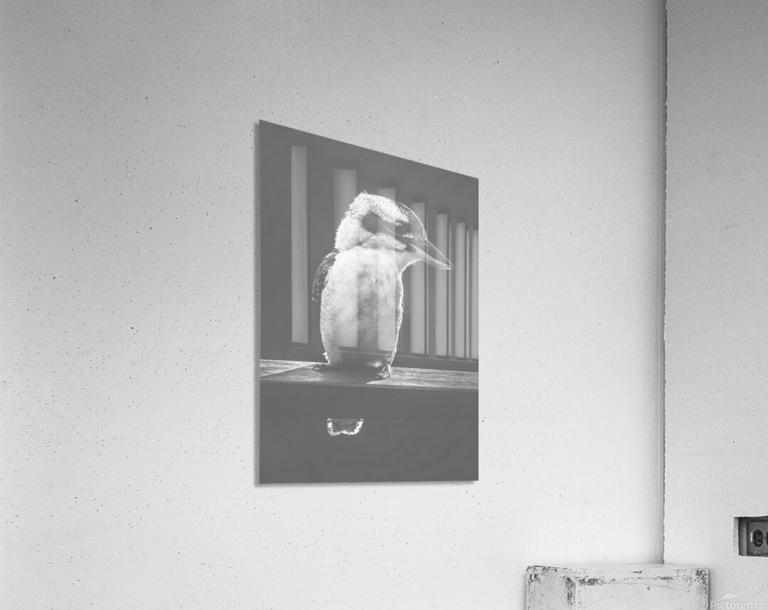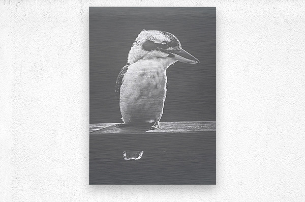 Iconic scene from Australia with a verandah railing perched Kookaburra standing in the grey sunlight with a bushy smile. Taken Murrumba Downs Queensla...[+]