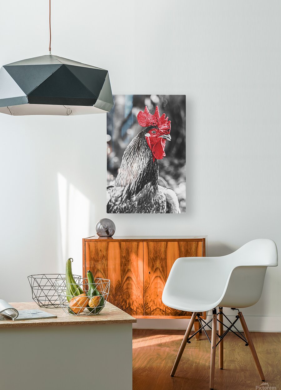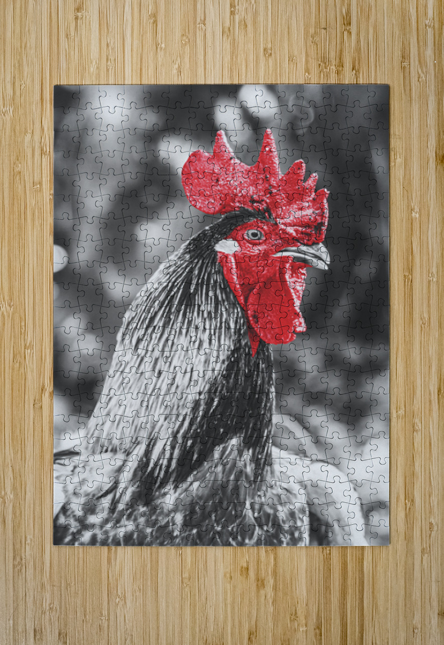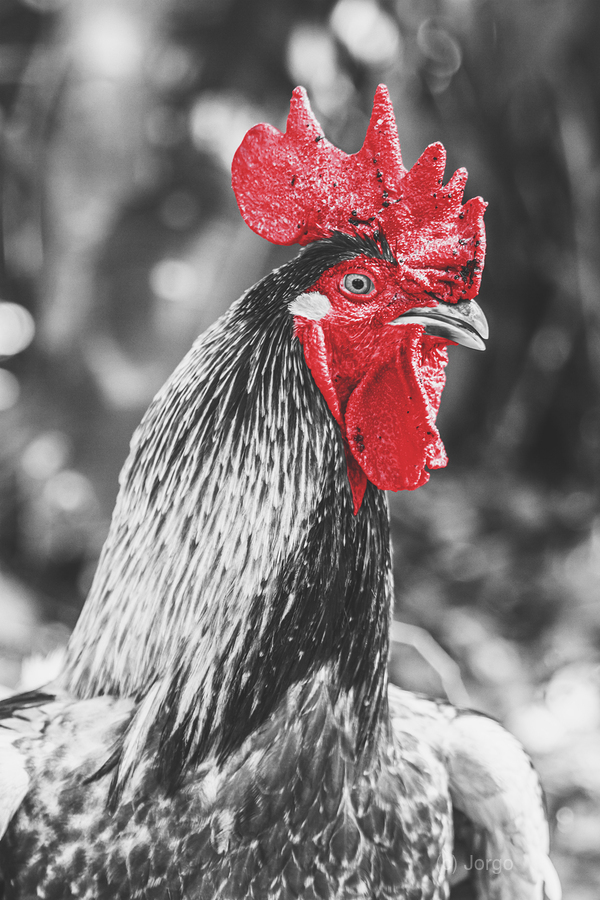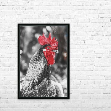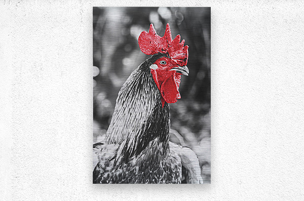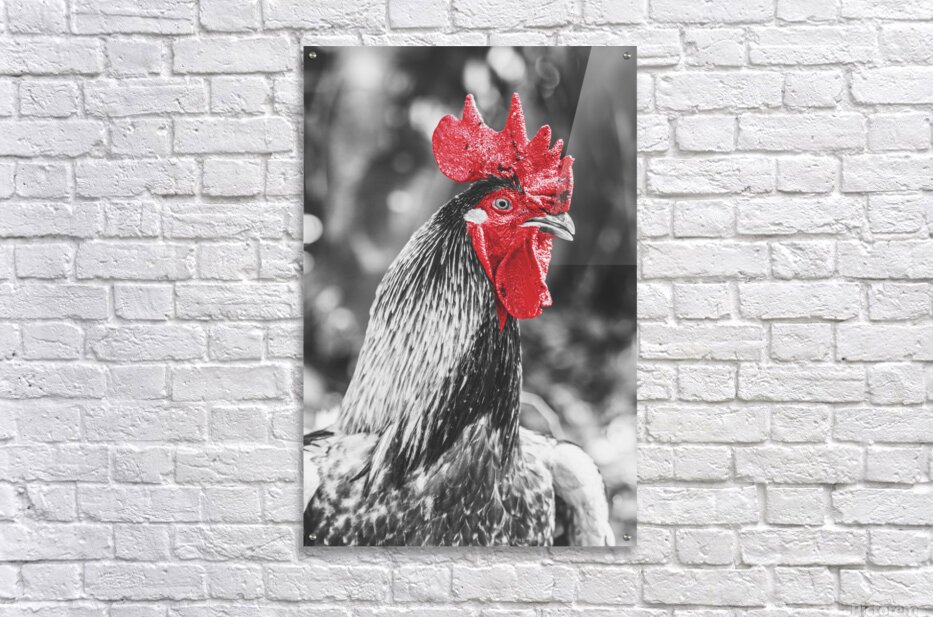 Farmyard country photo on the face of a red rooster captured in selective colour styling with bright red highlight. Captured Samford Valley Queensland...[+]