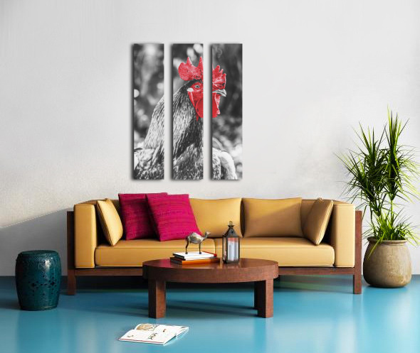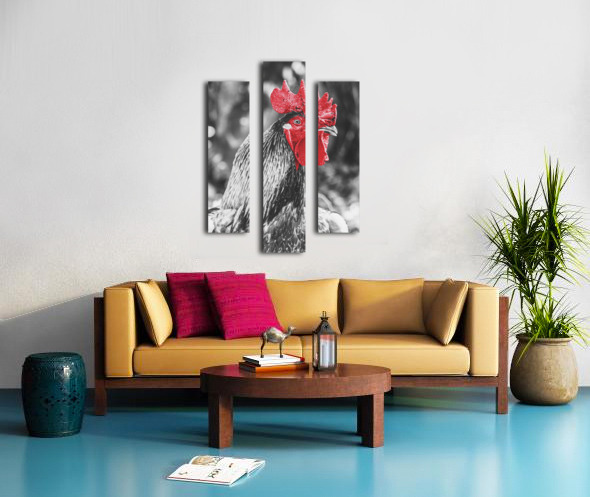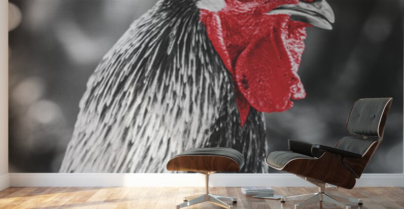 Farmyard country photo on the face of a red rooster captured in selective colour styling with bright red highlight. Captured Samford Valley Queensland Australia