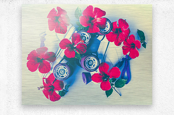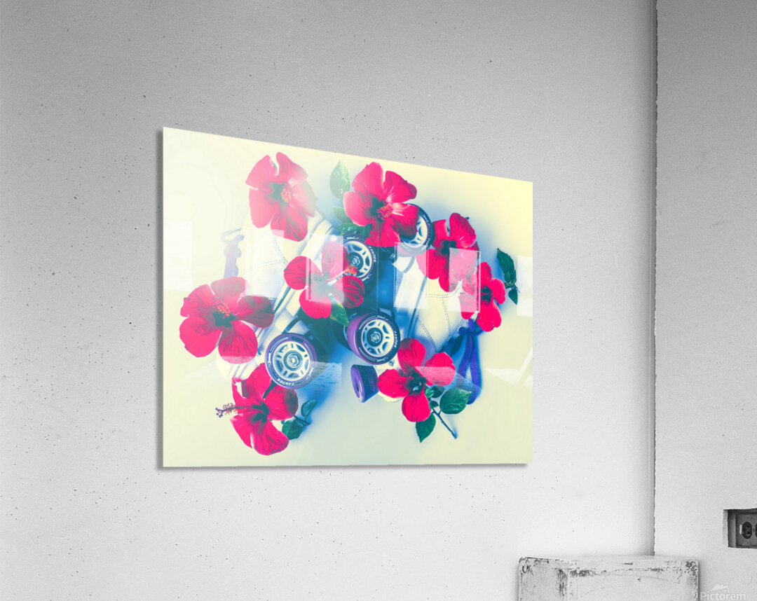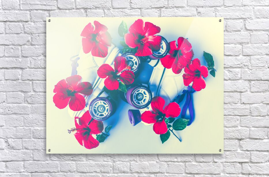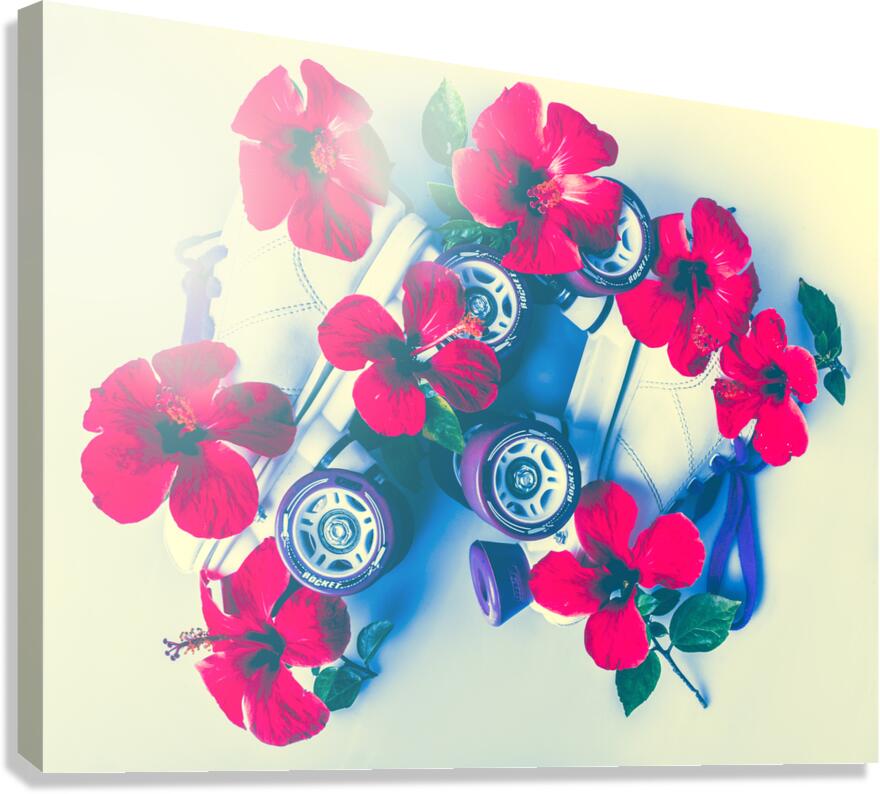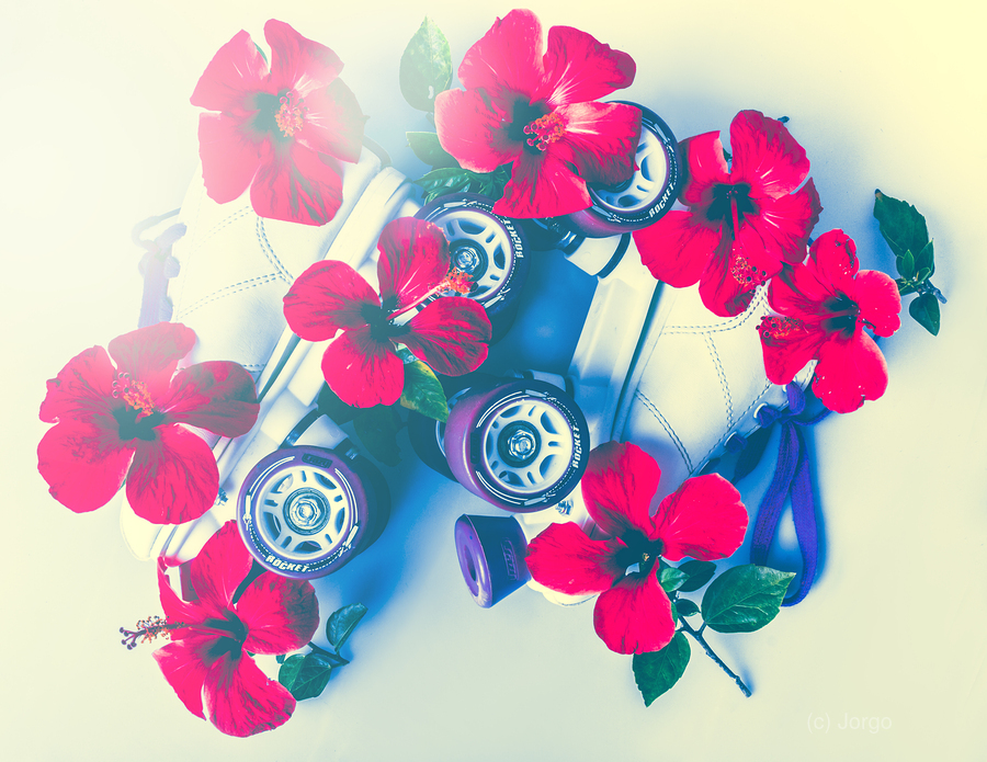 A retro roller skate romance with flared flowers and vintage rollerskates in tones of summer nostalgia