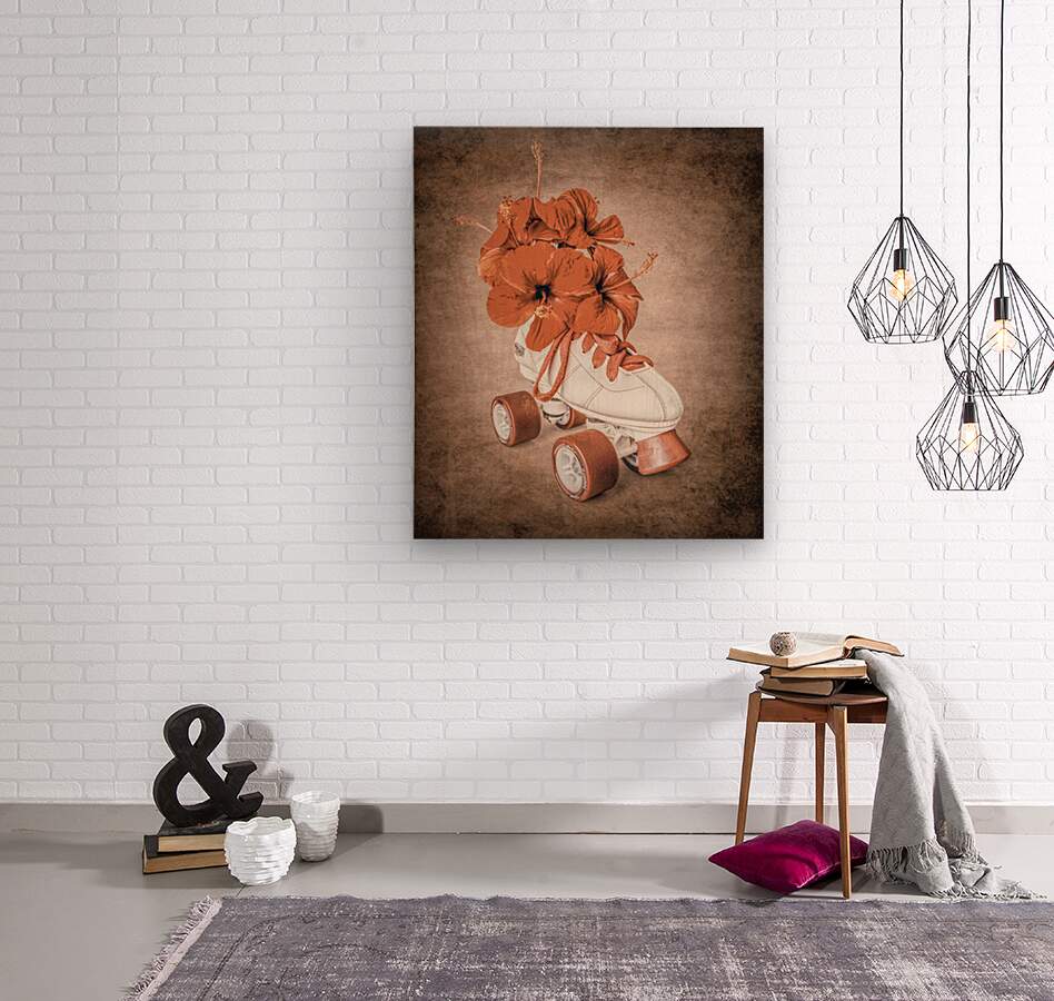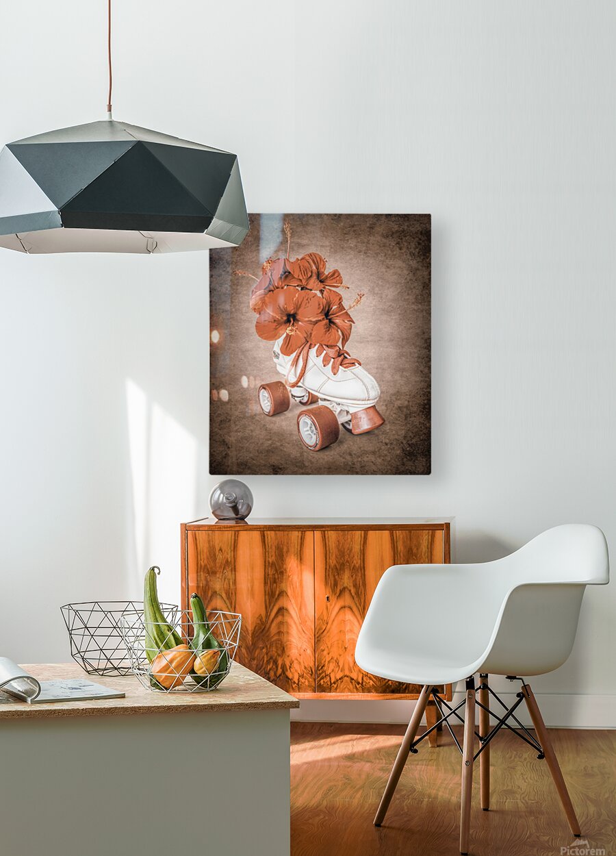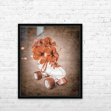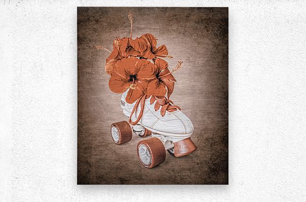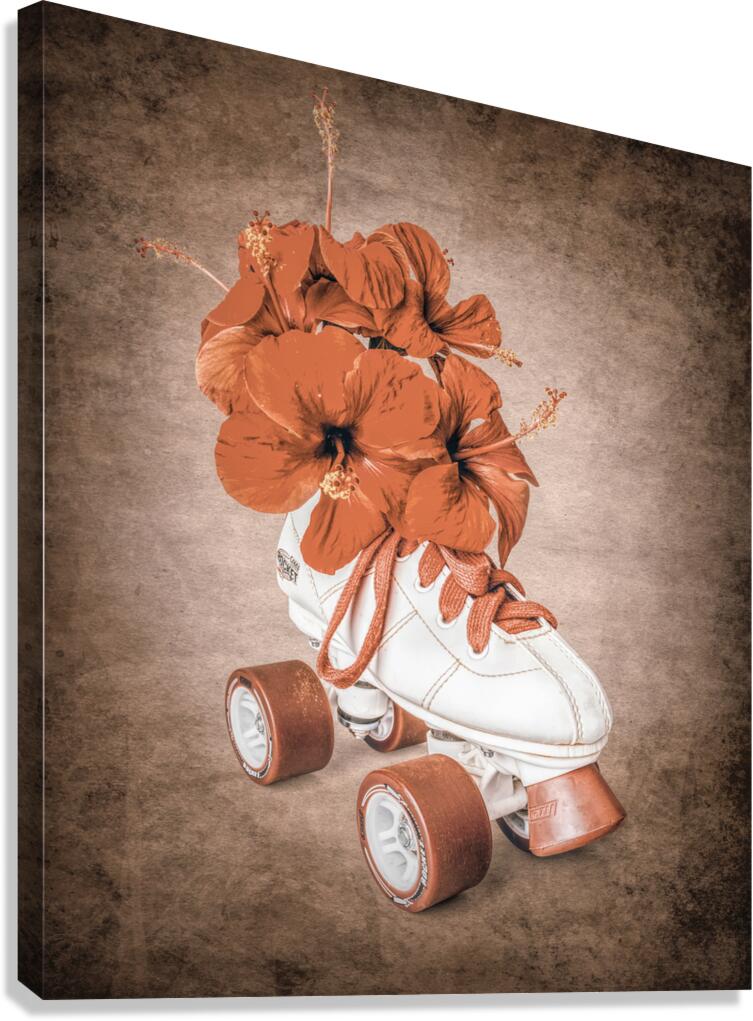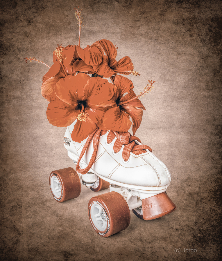 In playful sentiments a vintage rollerskate boot is filled and decorated with hibiscus flowers evoking old-fashioned nostalgia