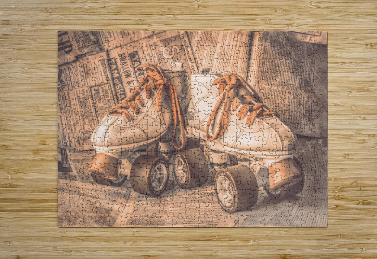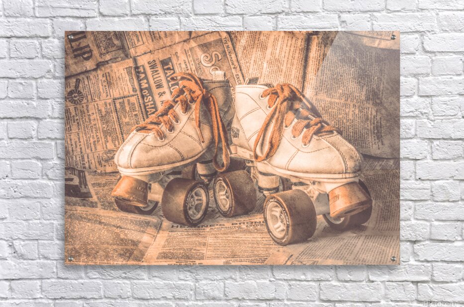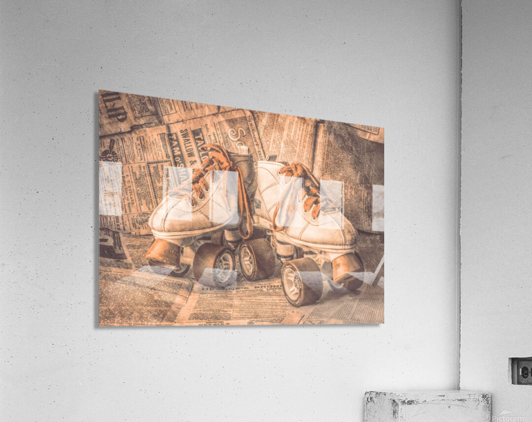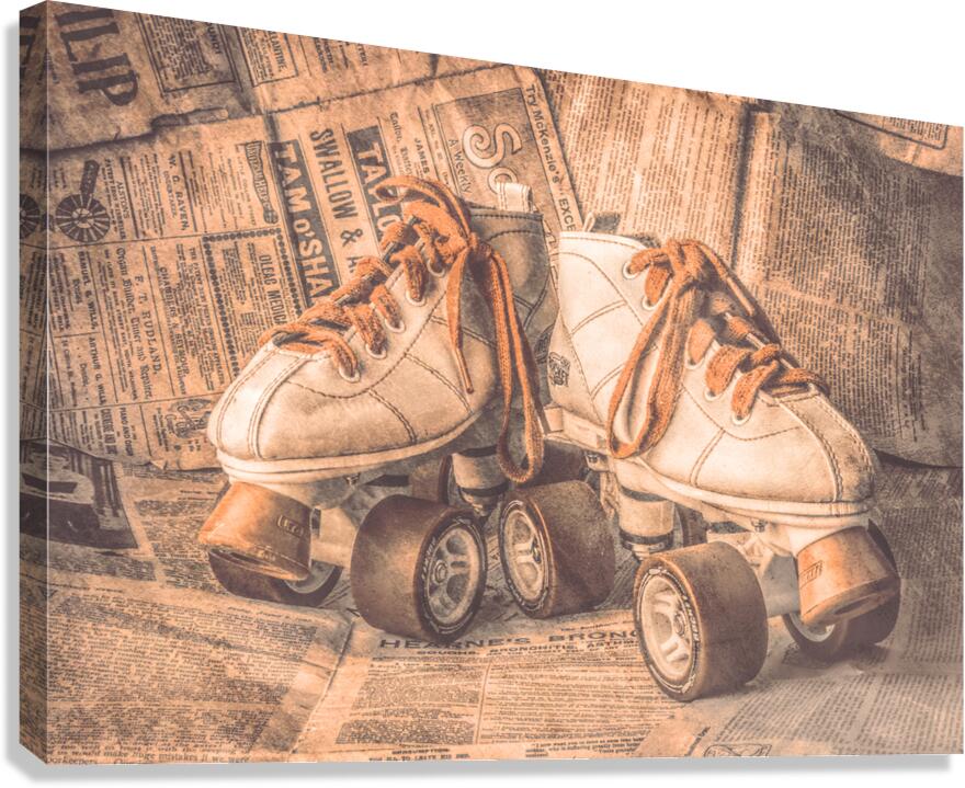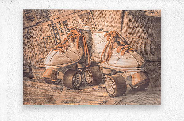 A lofty find in weathered nostalgia with antique rollerskating boots wrapped in newsprint from vintage eras