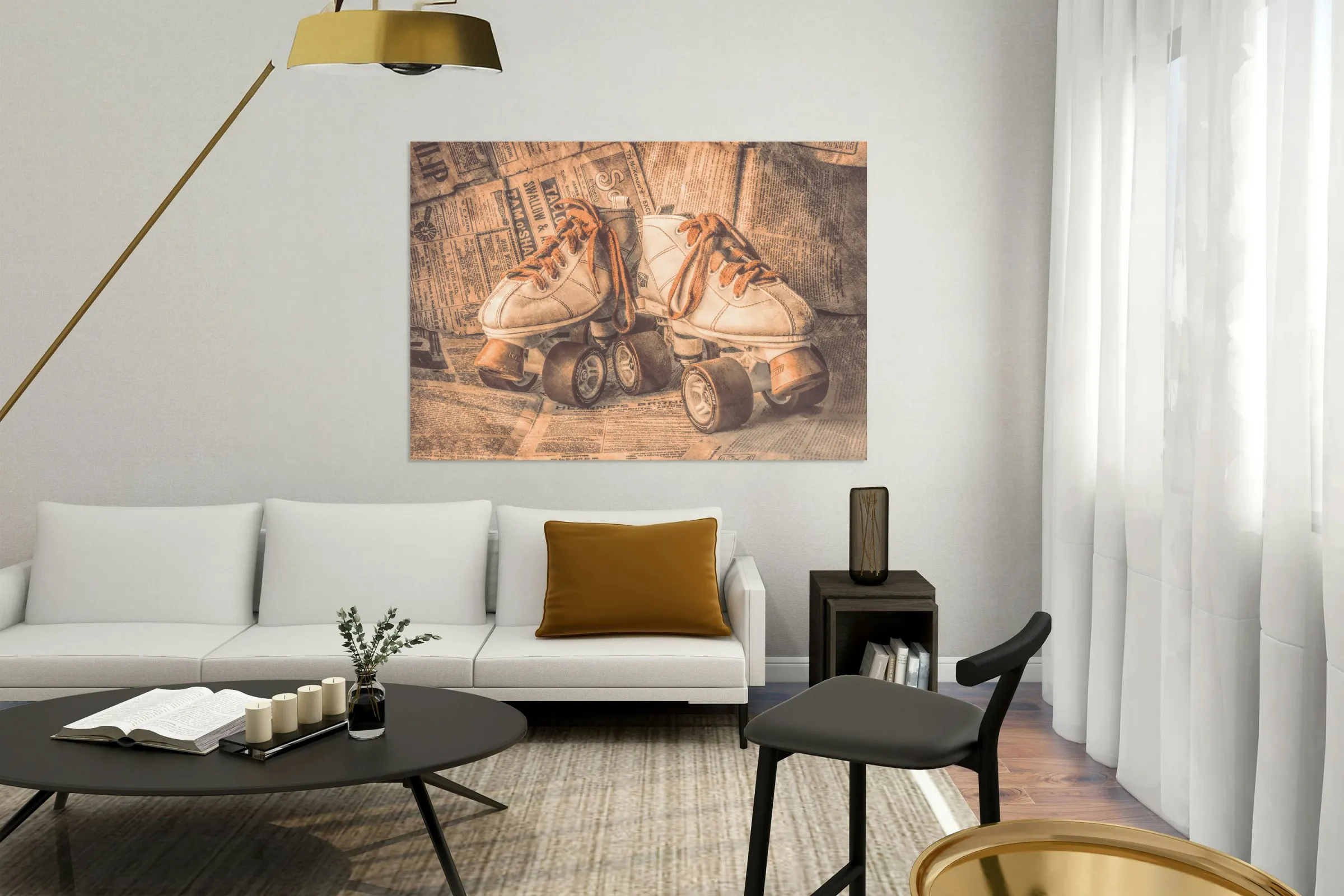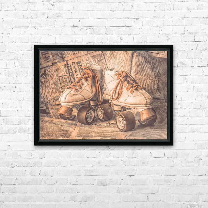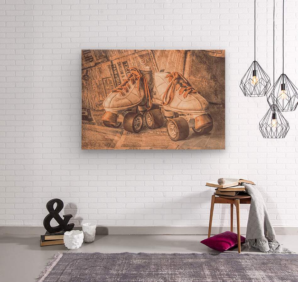 A lofty find in weathered nostalgia with antique rollerskating boots wrapped in newsprint from vintage eras