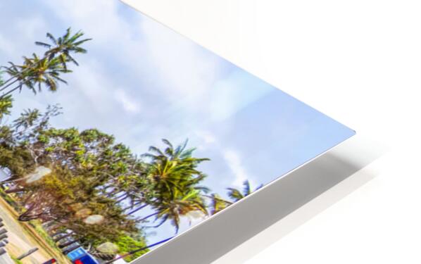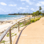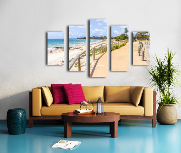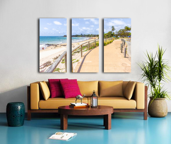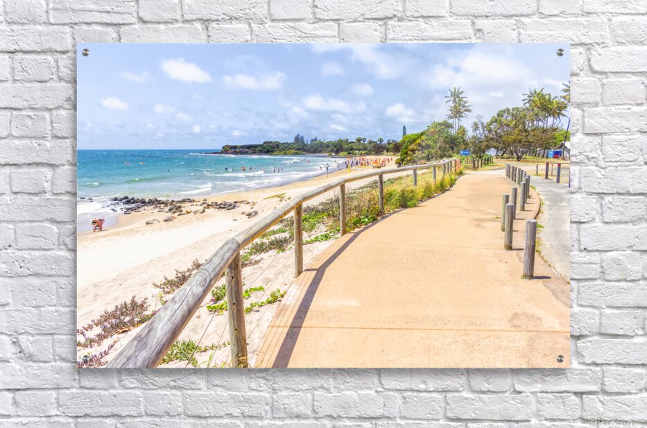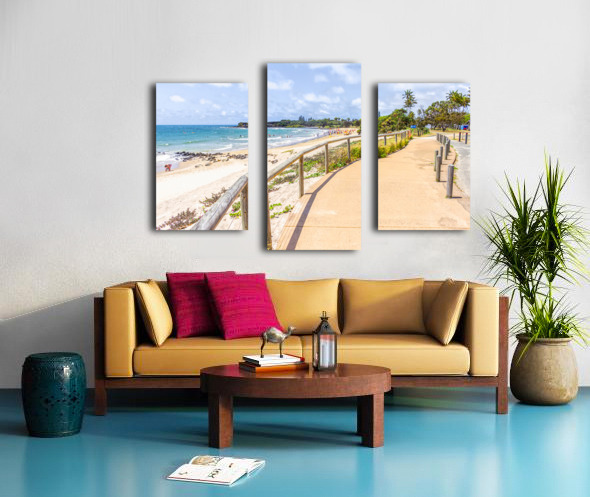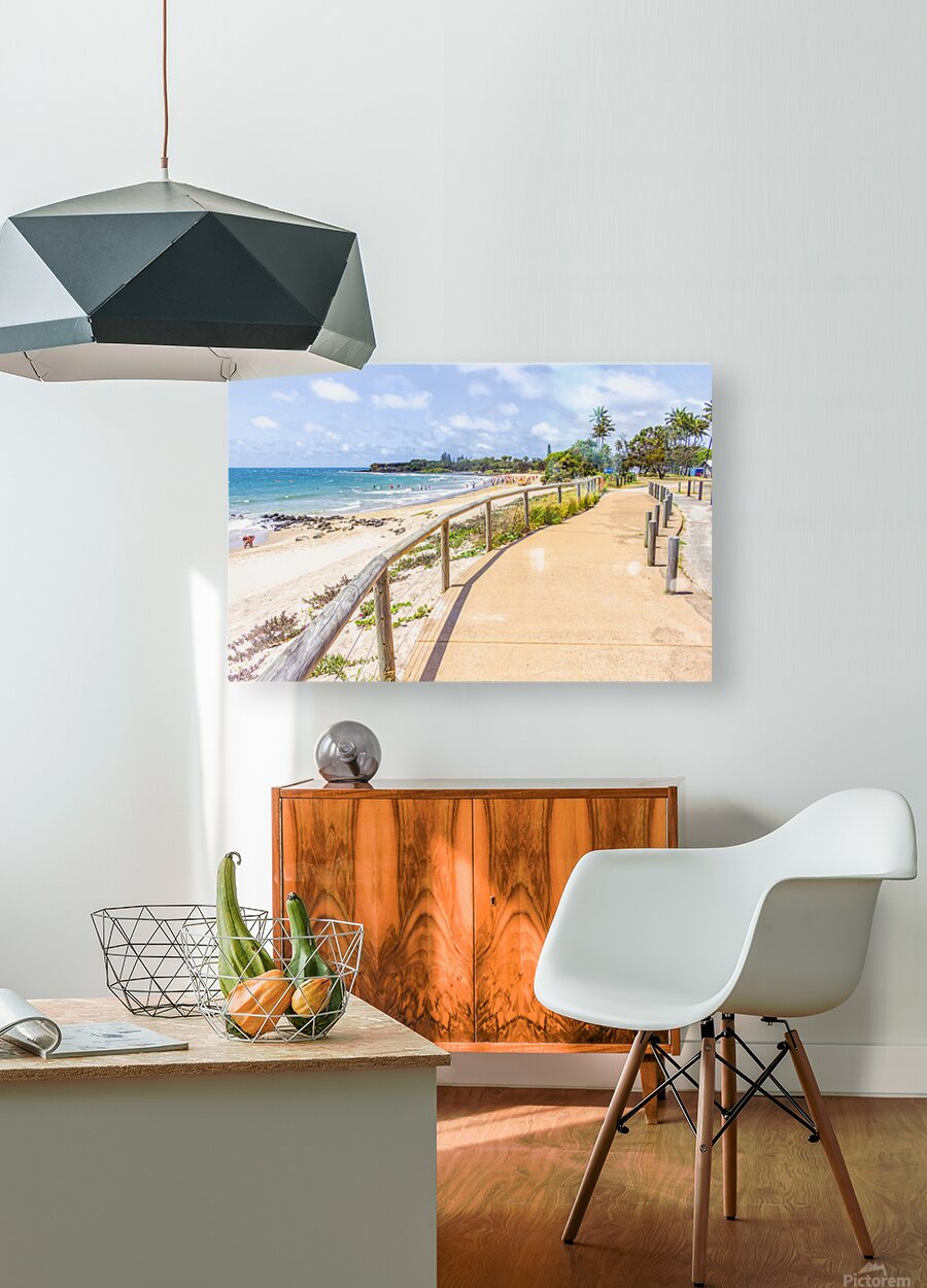 Bright and sunny landscape art of a bustling Queensland beach covered in lifestyle and colour with tourists and beachgoers and boardwalk perspectives....[+]