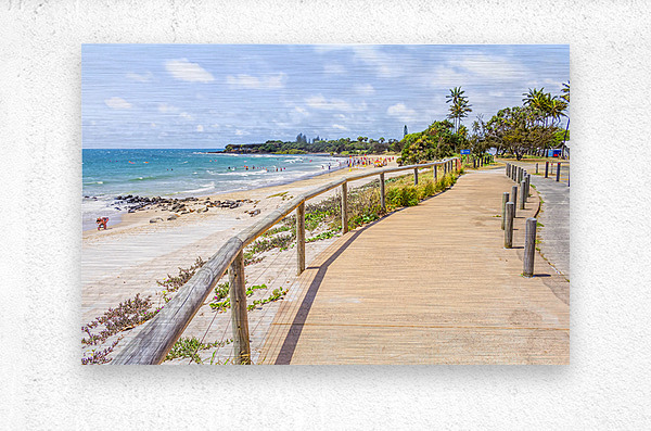 Bright and sunny landscape art of a bustling Queensland beach covered in lifestyle and colour with tourists and beachgoers and boardwalk perspectives. Bargara QLD Australia