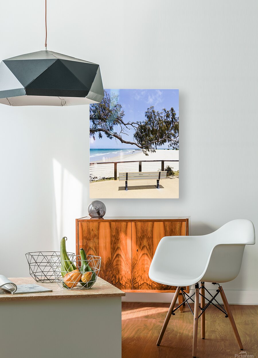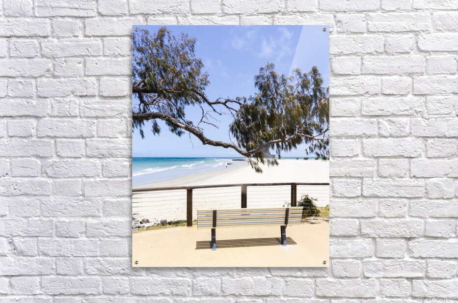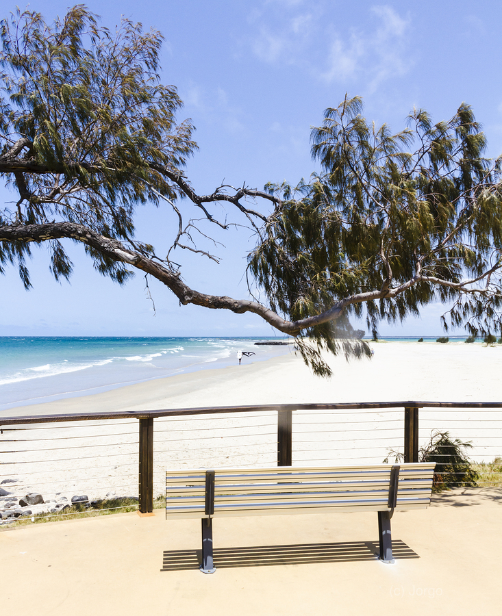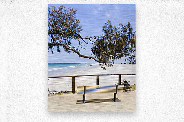 A serene bench displays a stunning view of Elliott Heads beach with gentle waves and clear blue skies in Queensland Australia