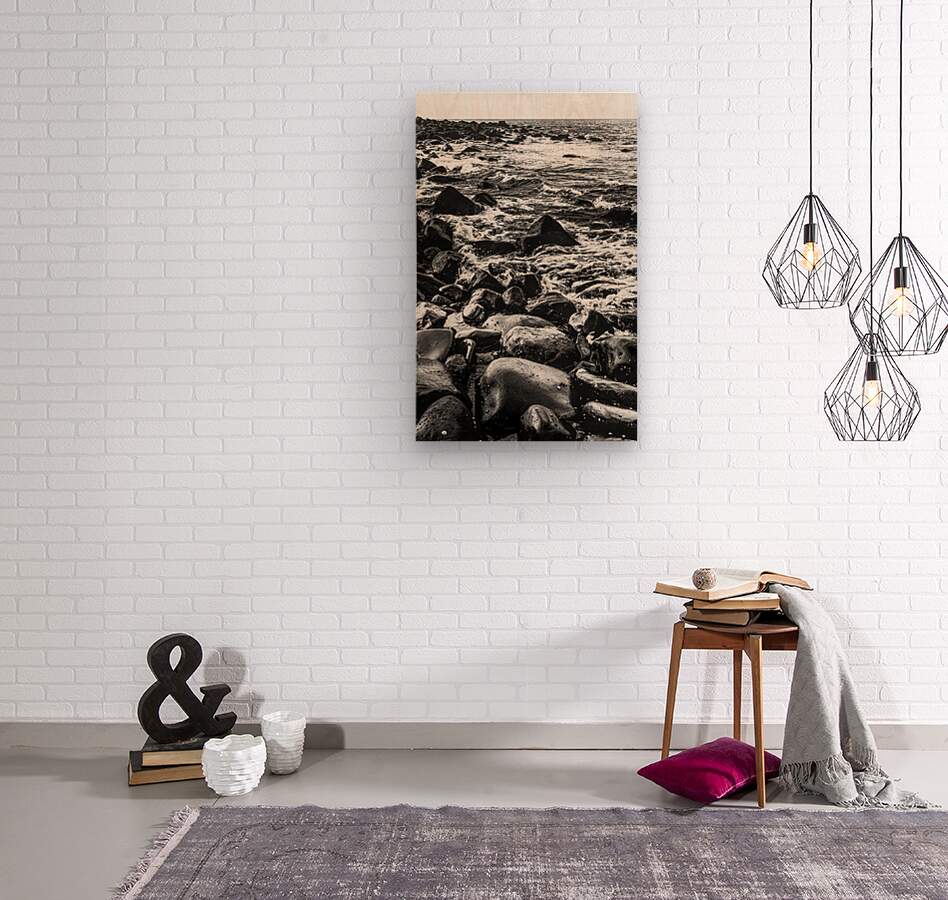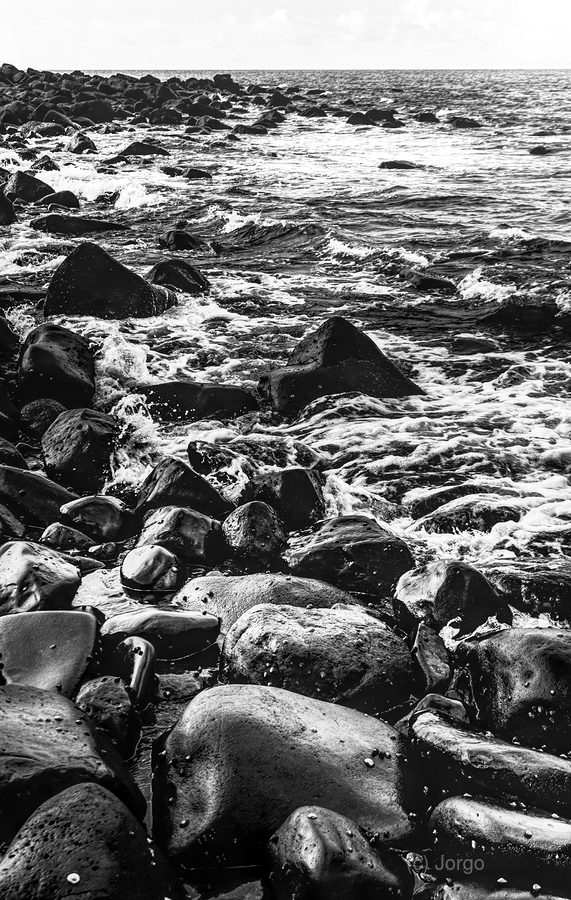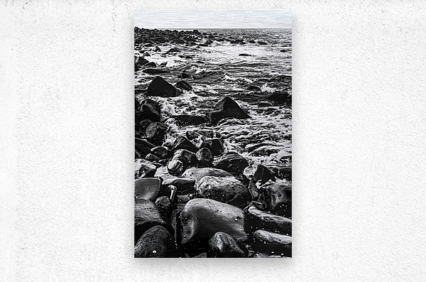 Dramatic dark and tense landscape of rolling tides and rocky shores shaded in black and white and grey. Photo taken: Bargara Queensland Australia
