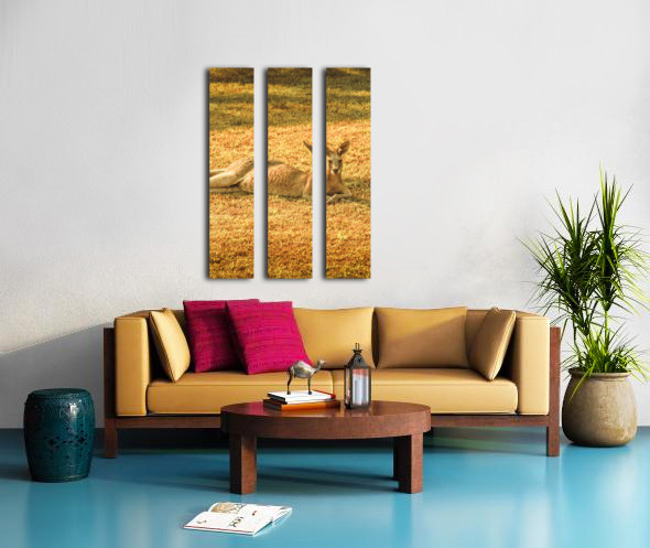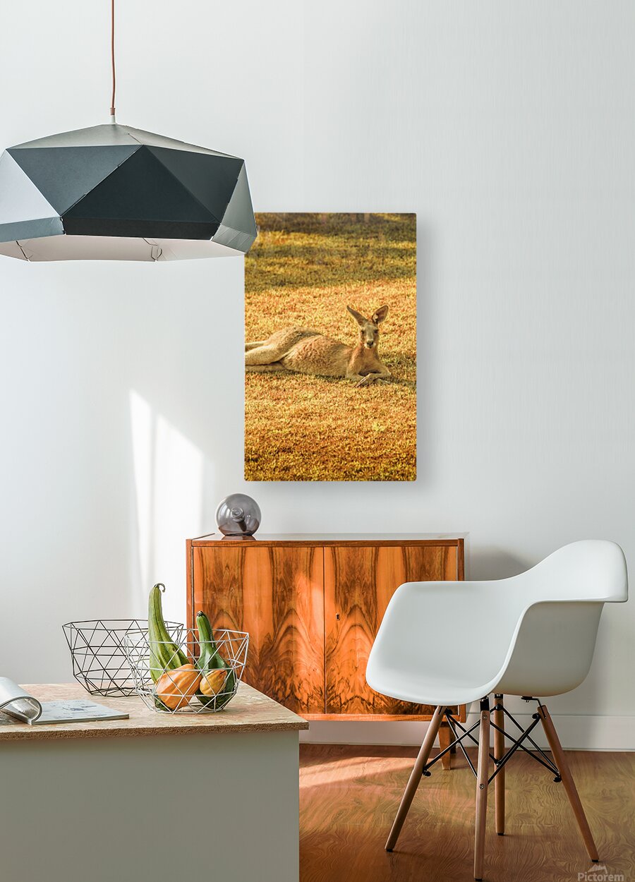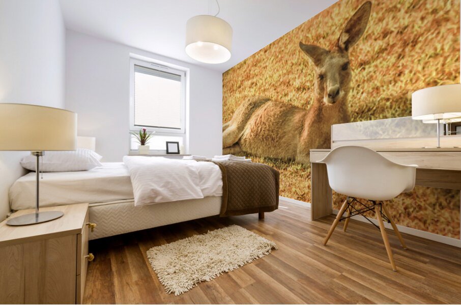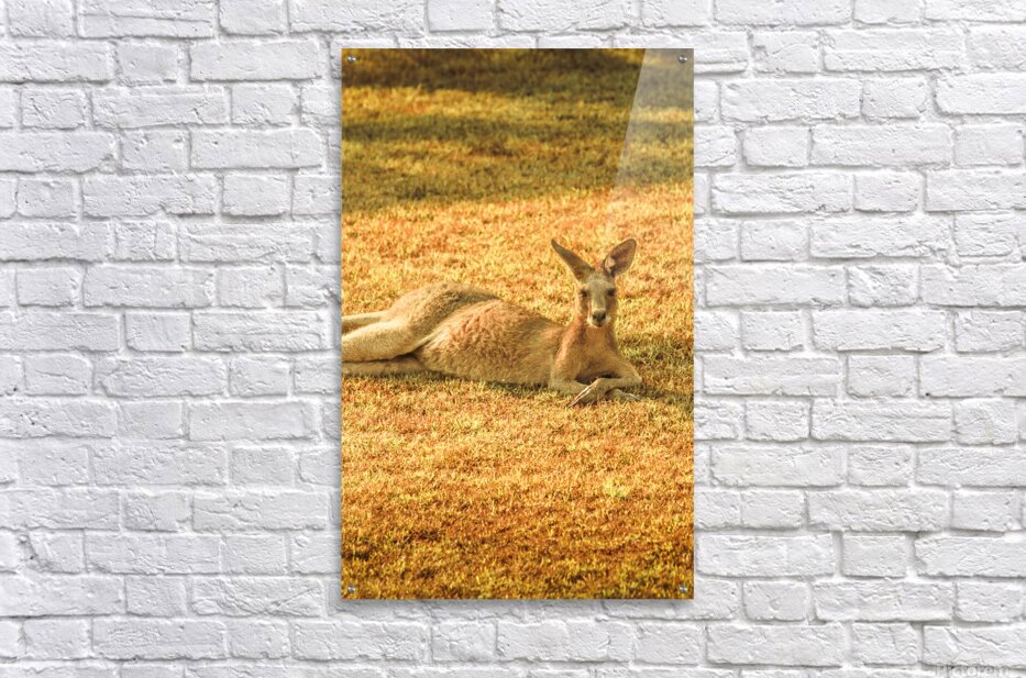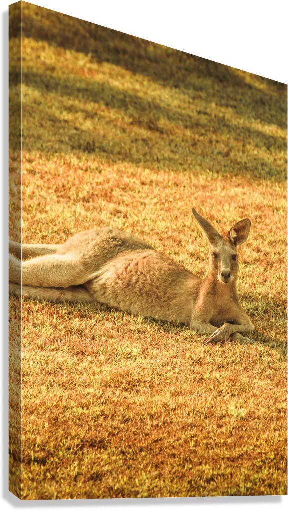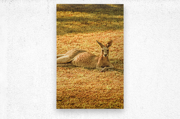 A kangaroo lounges peacefully on the front lawn grass in Bargara Queensland enjoying the warm sun during a beautiful morning in Australia’s coastal paradise.
