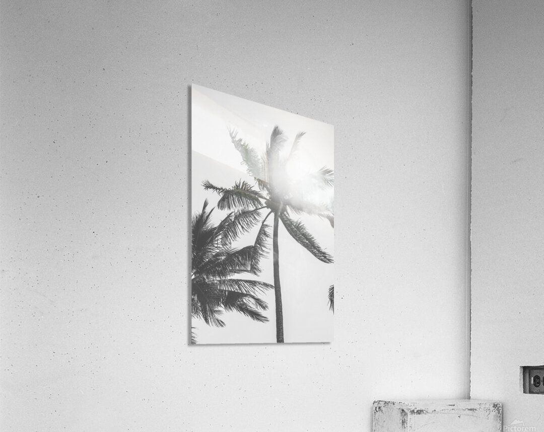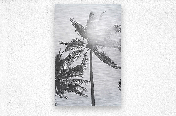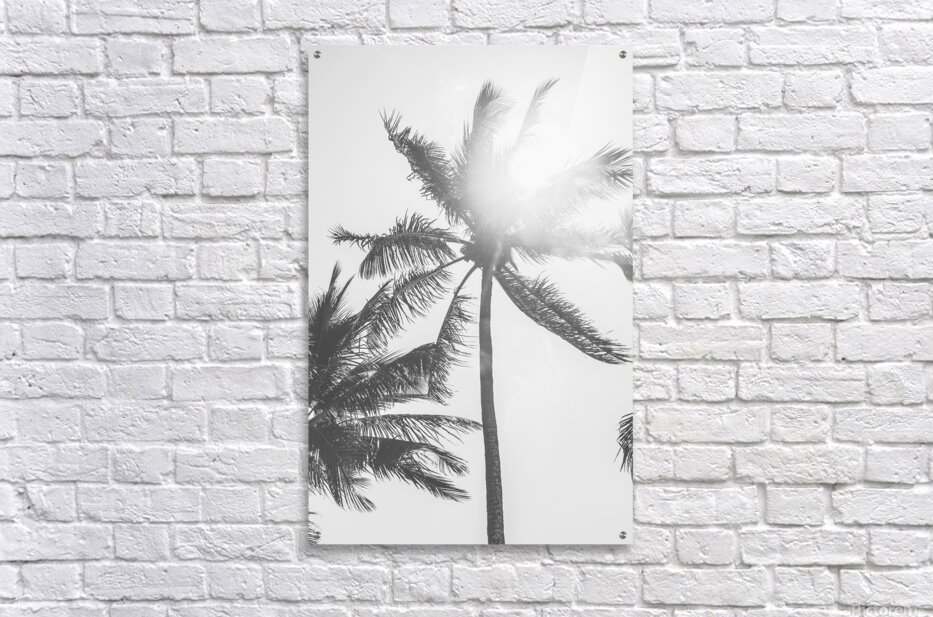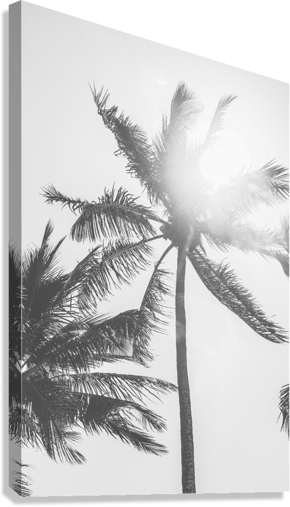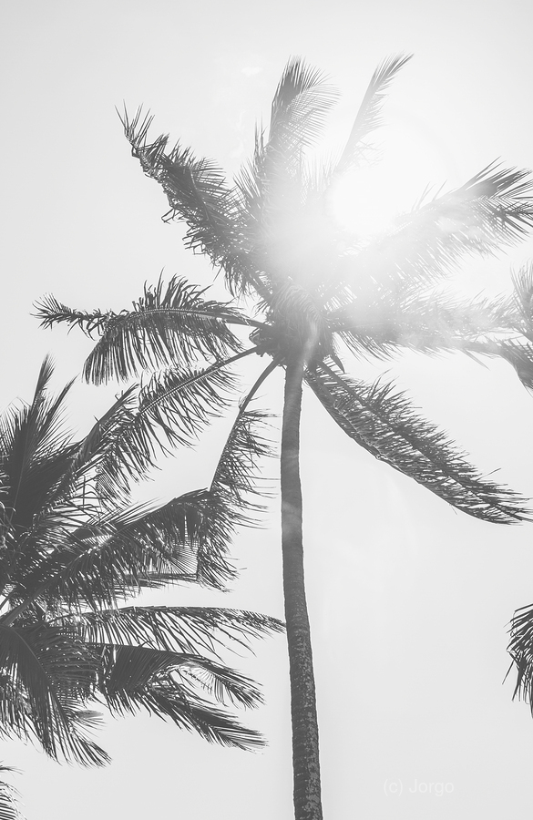 A monochrome mast of palm trees and piecing sunlit from beach canopies above. Taken: Bargara Queensland Australia