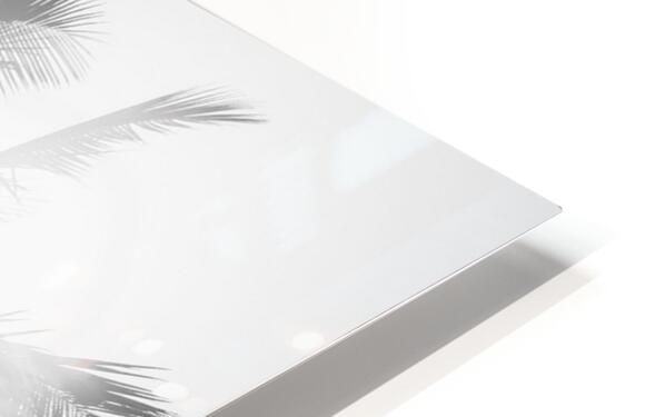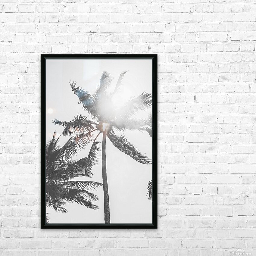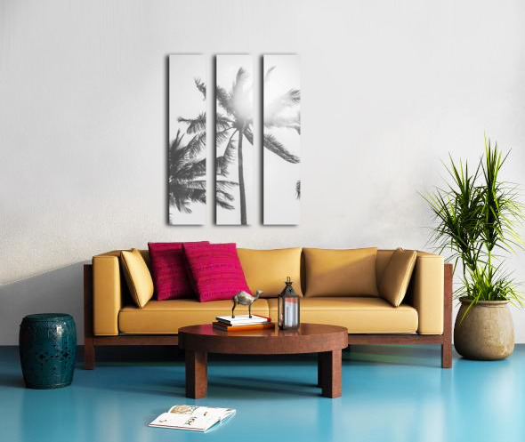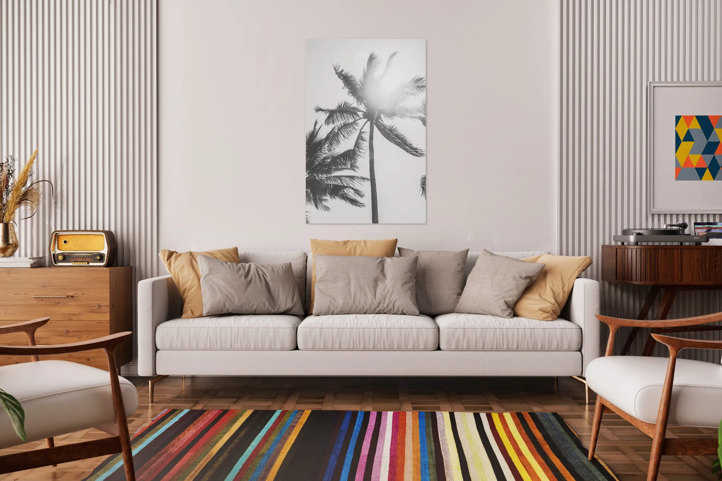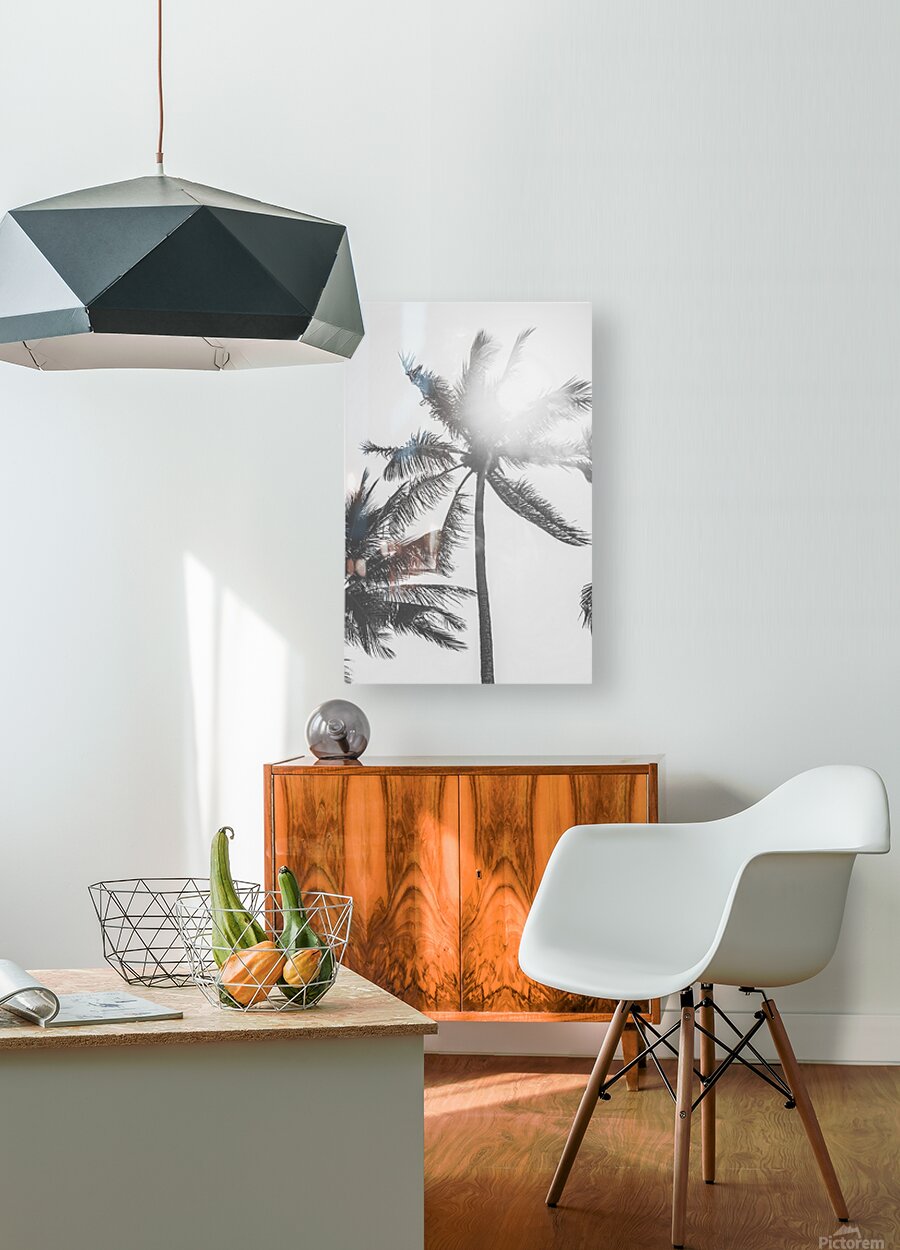 A monochrome mast of palm trees and piecing sunlit from beach canopies above. Taken: Bargara Queensland Australia