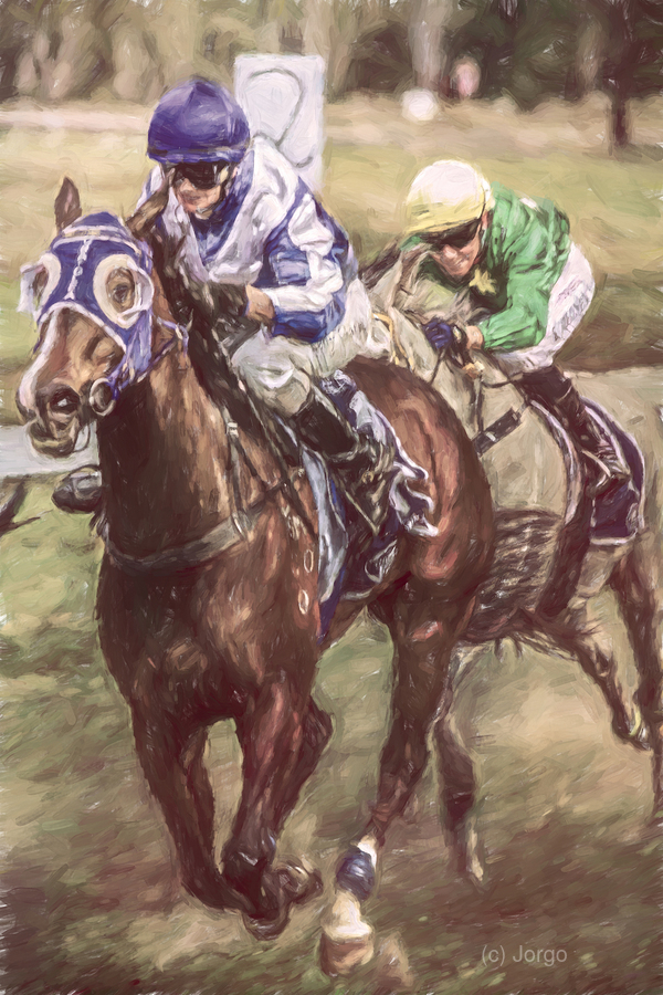 Vintage sports in antique styling with jockeys and racing horses galloping at pace on a race track in antique oil painting style. Taken: 2025 Mount Perry Races, Queensland, Australia