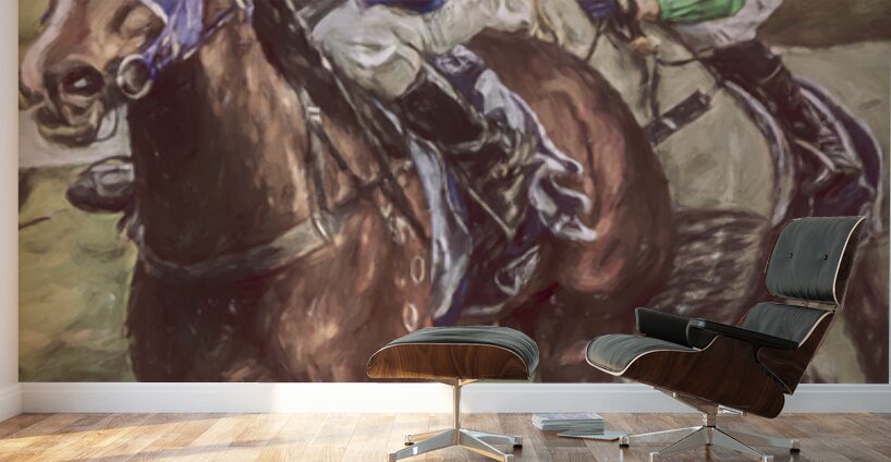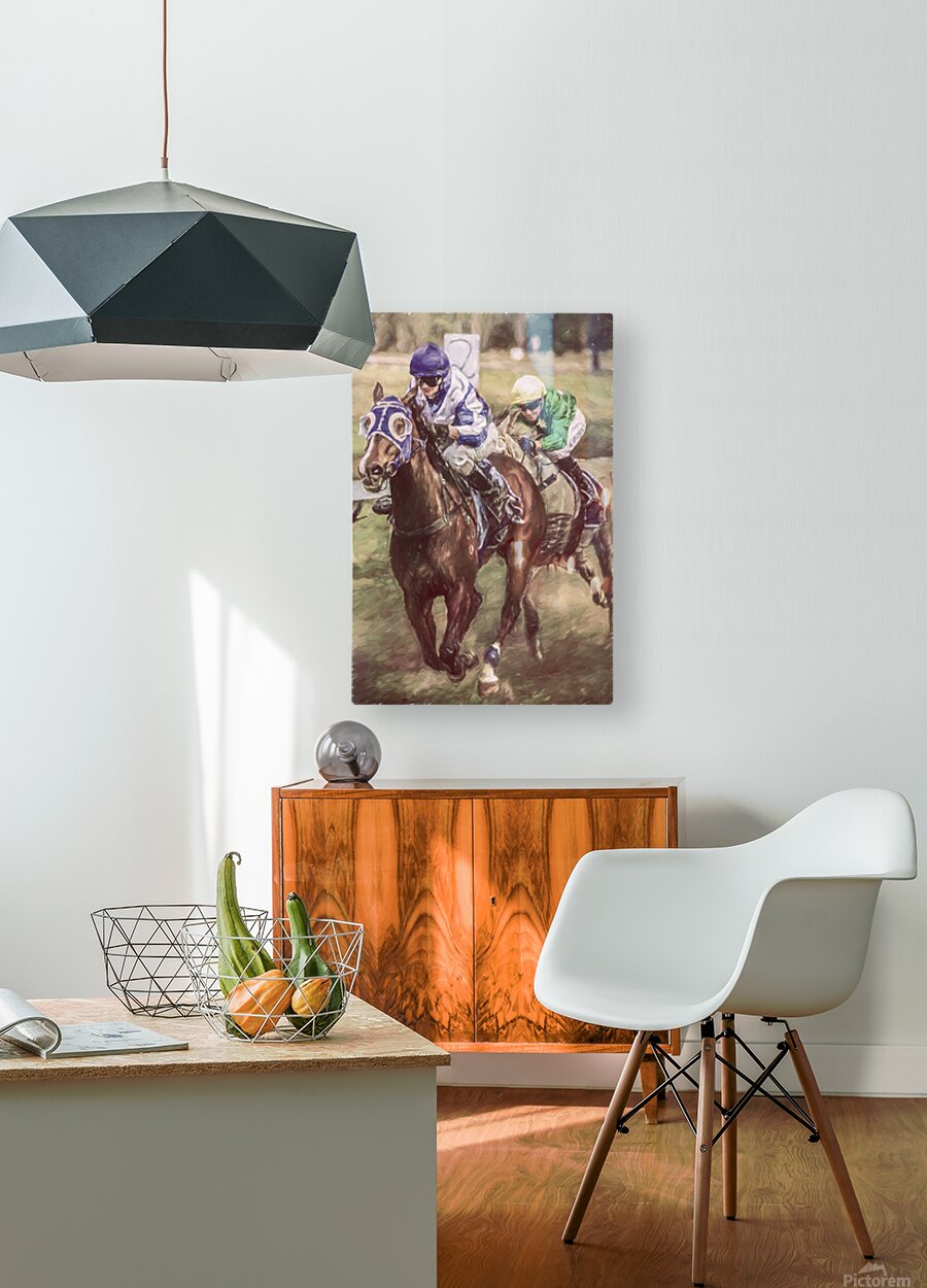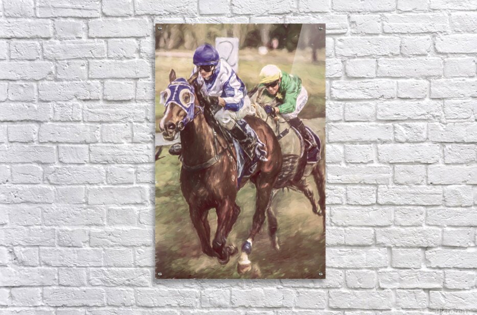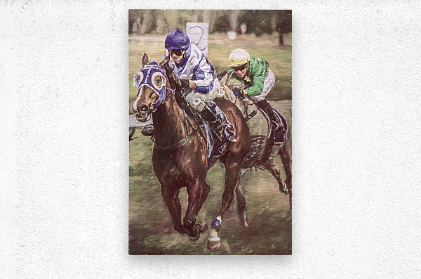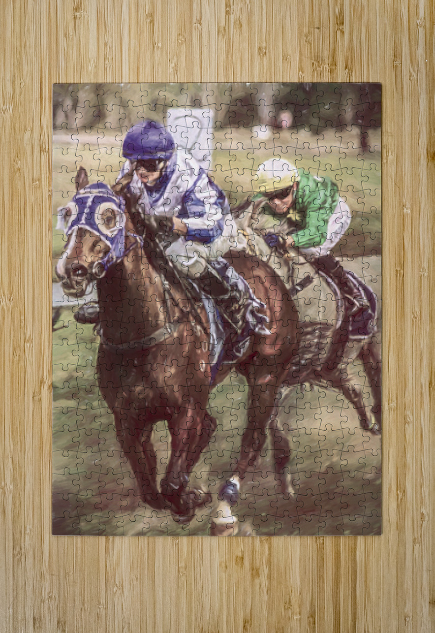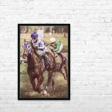 Vintage sports in antique styling with jockeys and racing horses galloping at pace on a race track in antique oil painting style. Taken: 2025 Mount Pe...[+]