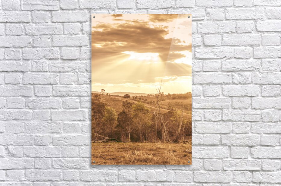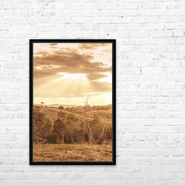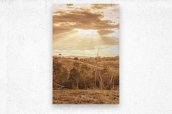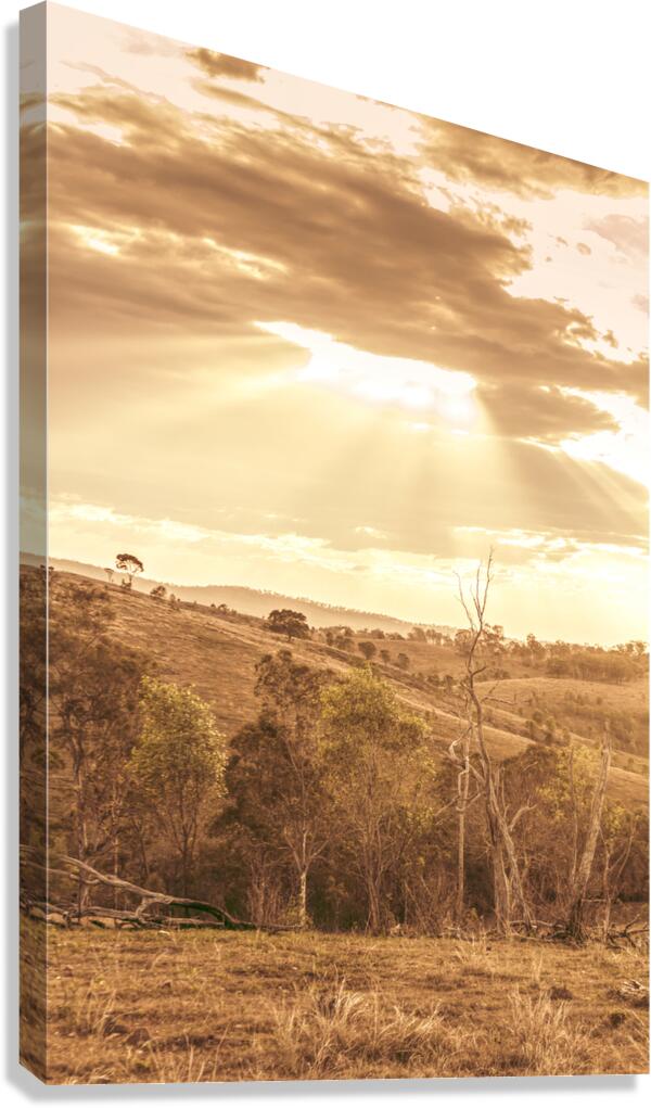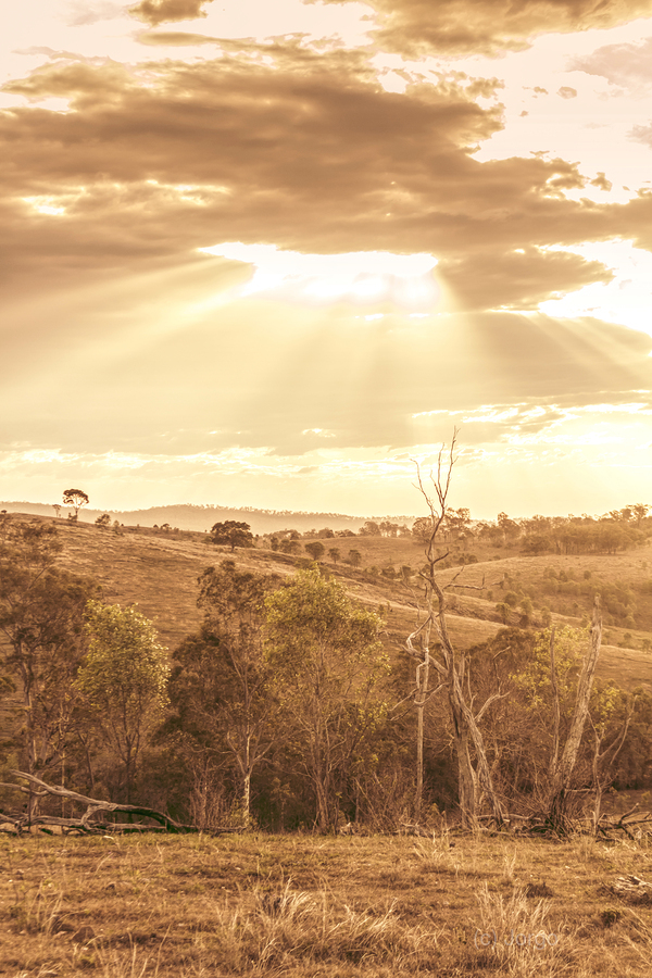 Late afternoon sun rays spill over the hills of Mount Perry illuminating the gorgeous golden hills of country paradise. Queensland Australia