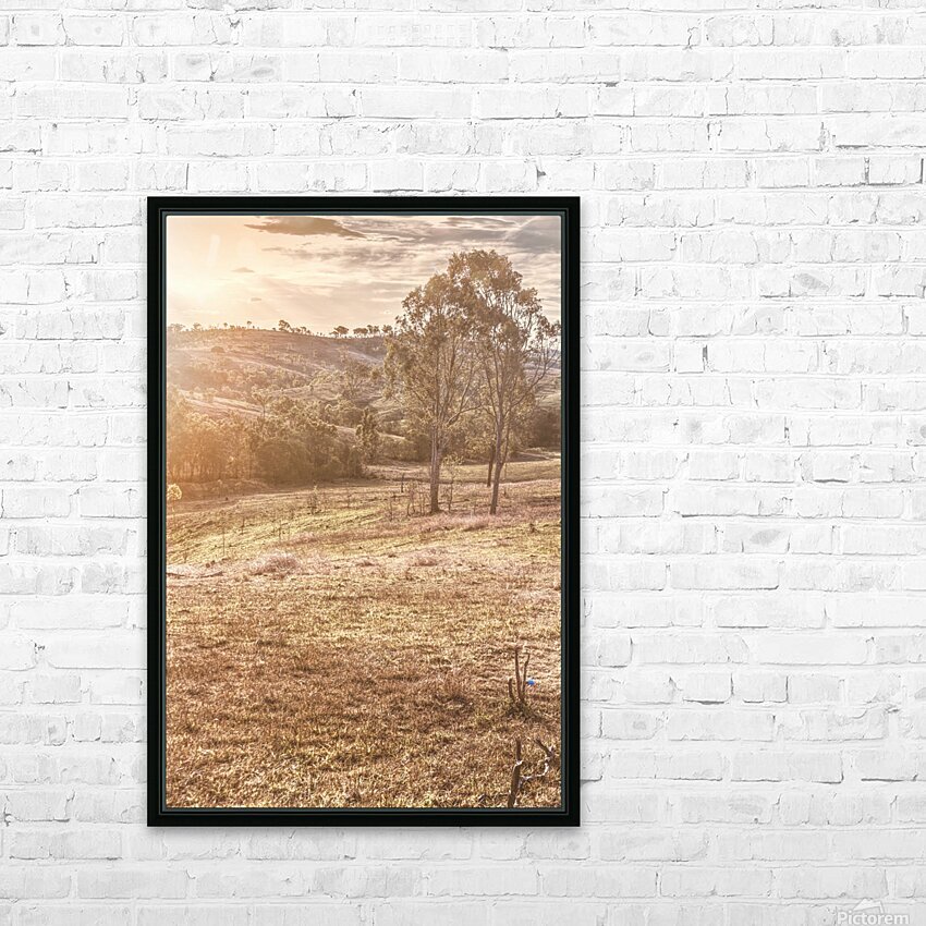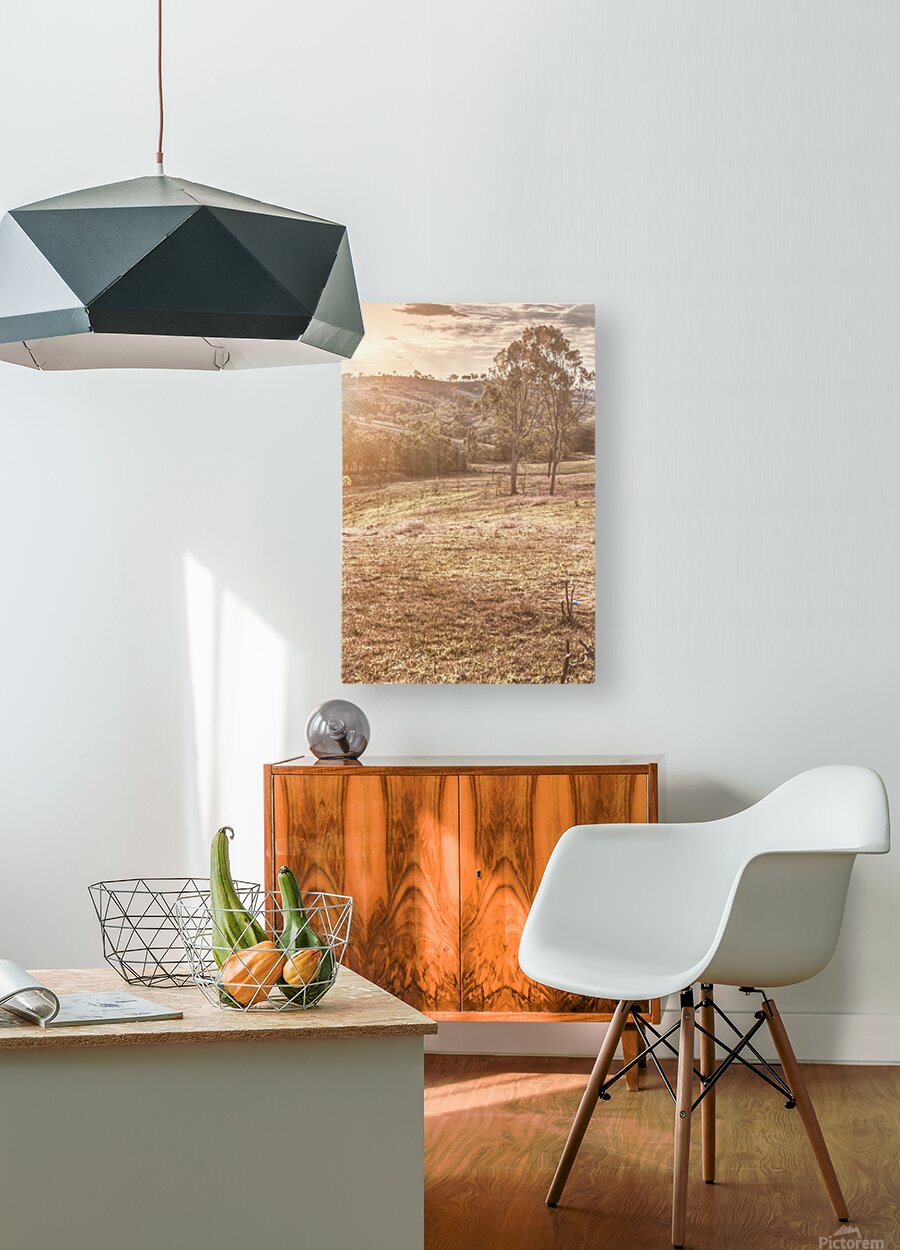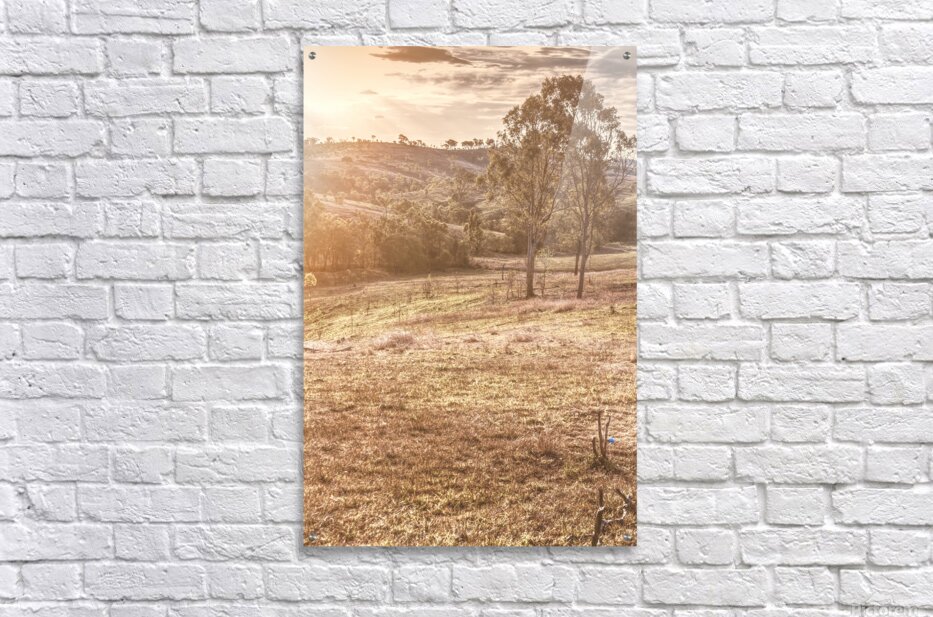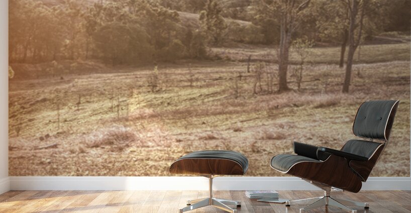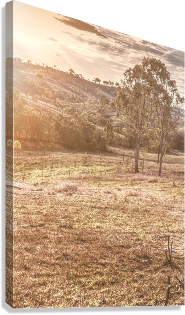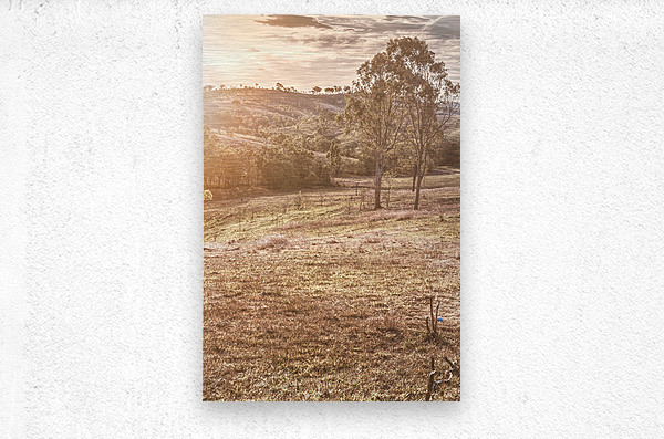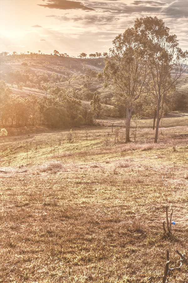 A beautiful sunset bathes the hills in golden light with gentle slopes and tall trees and a wash of pastel color. Mt Perry Queensland Australia
