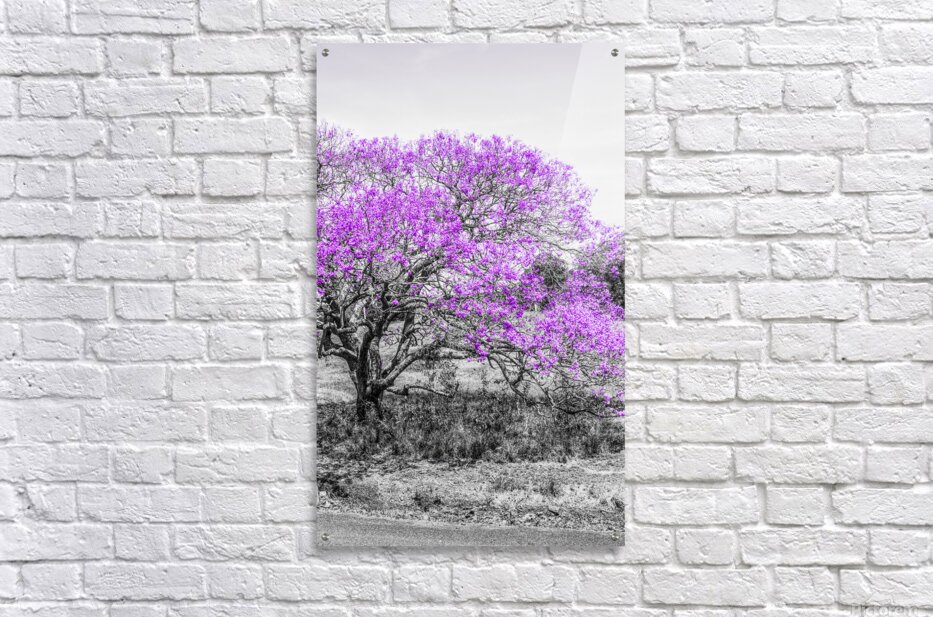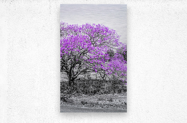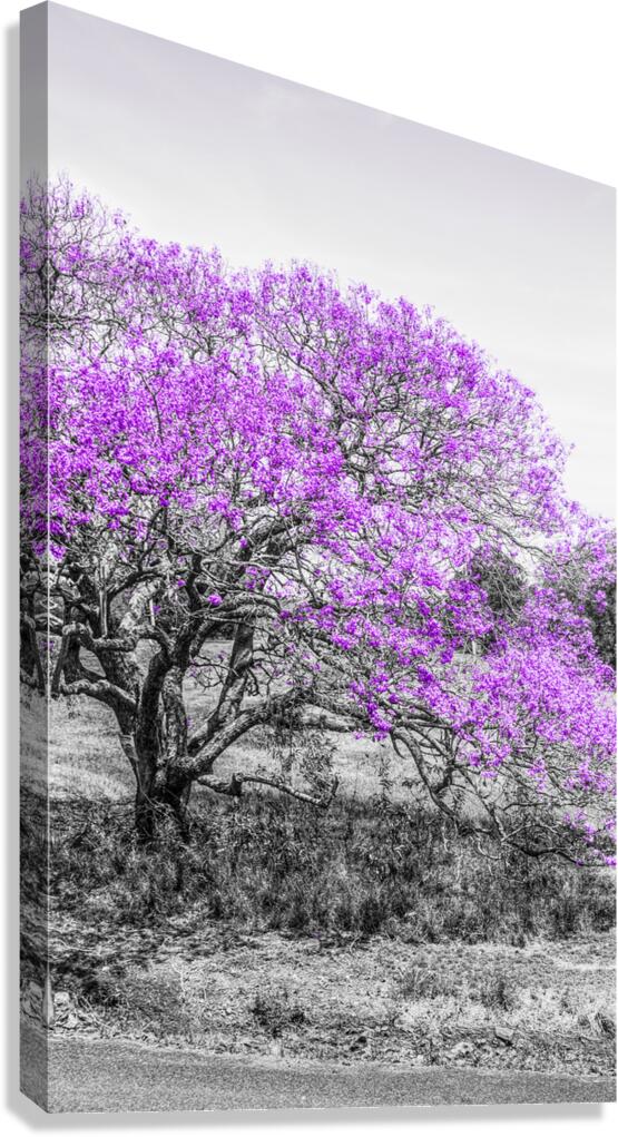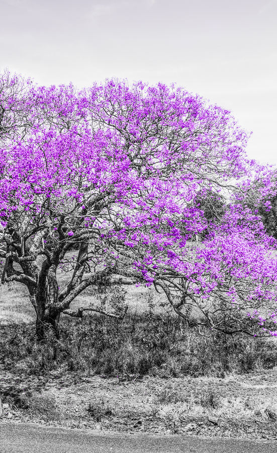 A rural scene of selective colouring with a Jacaranda tree highlighted by hues of light violet in a country background of black and white. Cordalba Qu...[+]