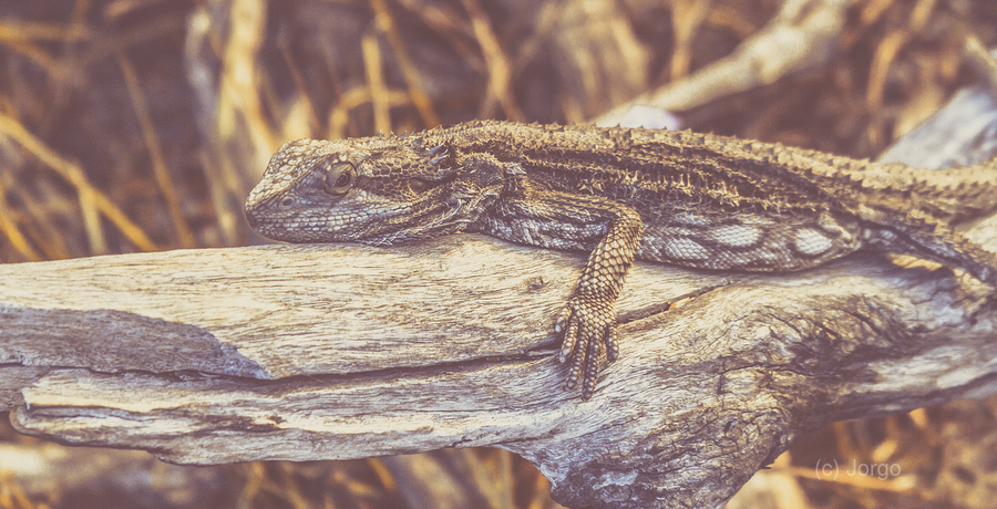 In a warm rugged countryside environment a bearded dragon rests comfortably on deadwood basking in the late afternoon sunlight. Taken: Mount Perry Que...[+]