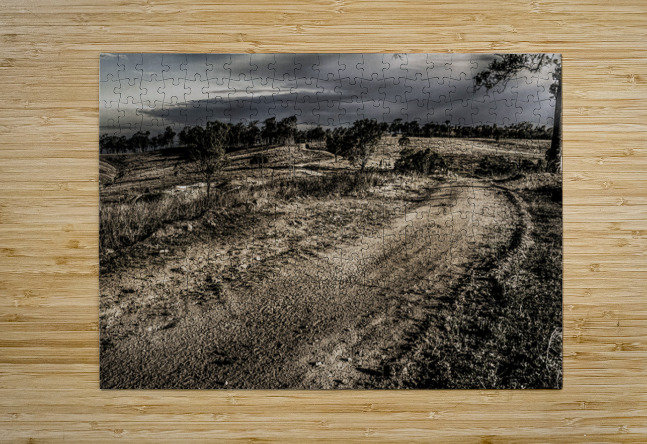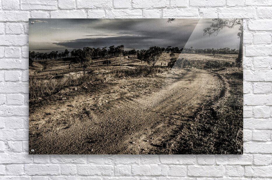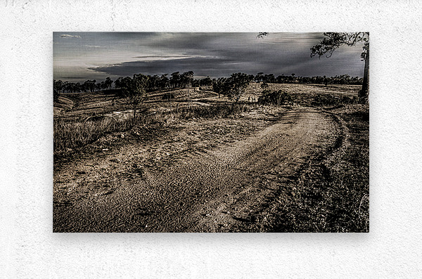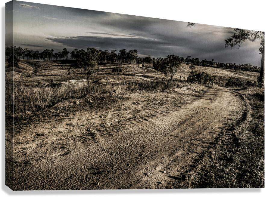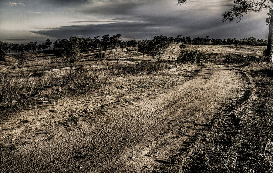 A rustic route of country contrast with a outback track travelling into dark skies in moody lands. Mt Perry Queensland Australia