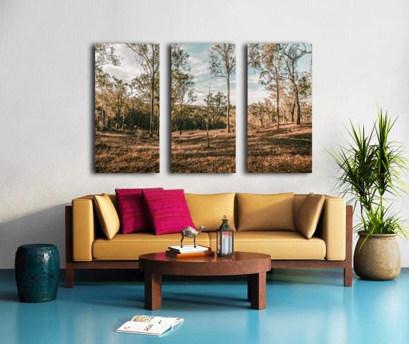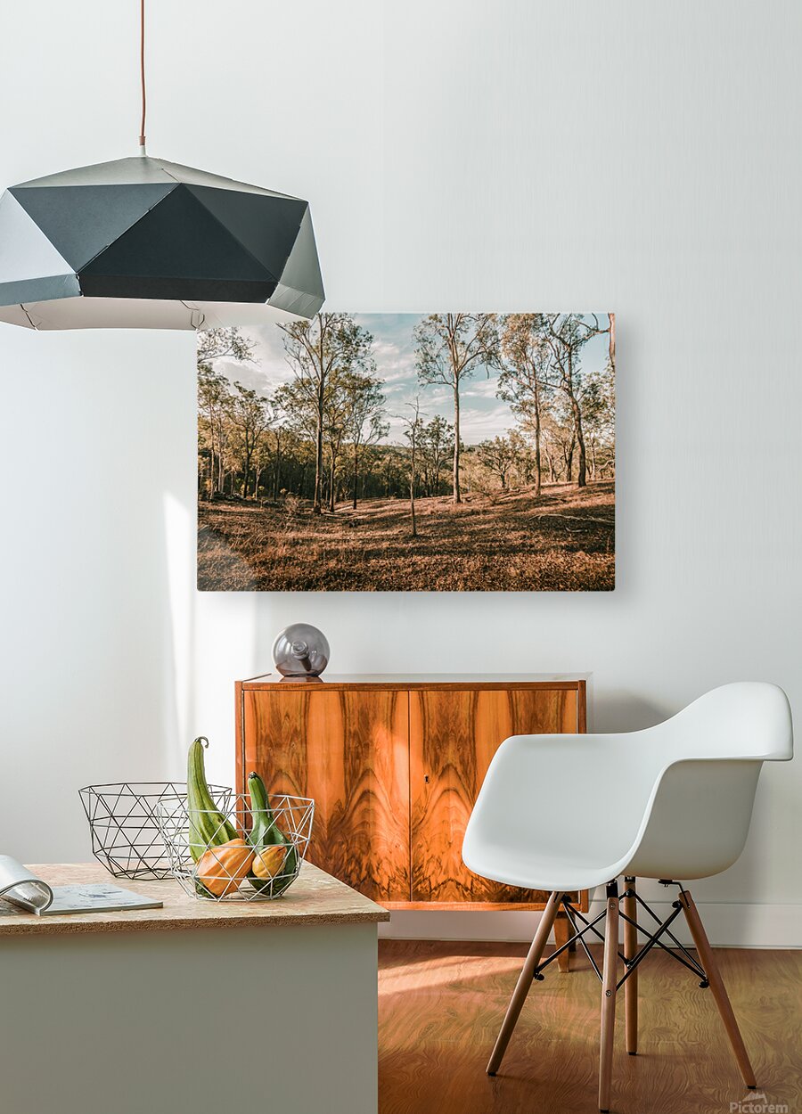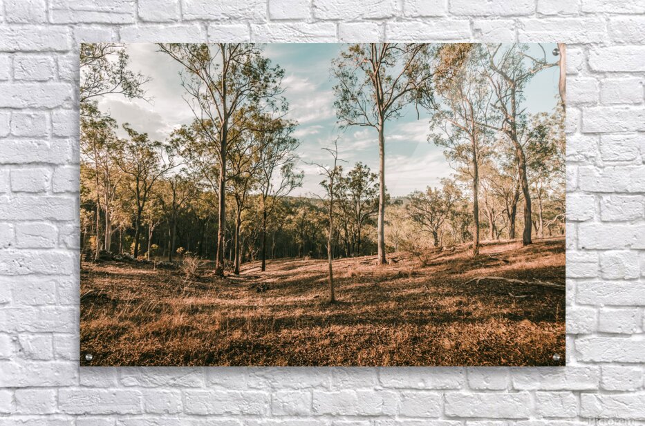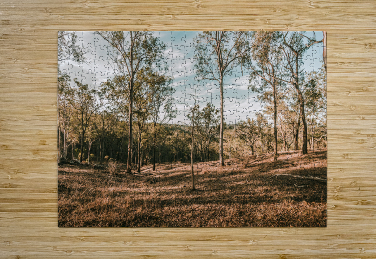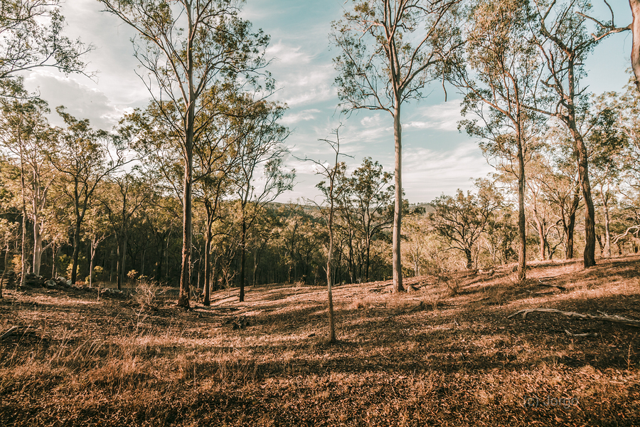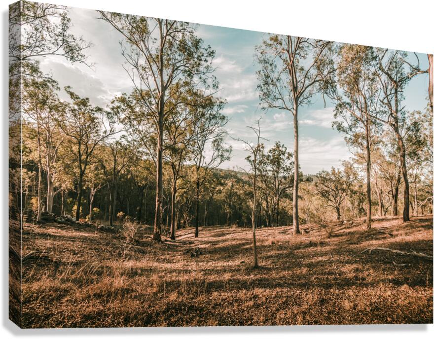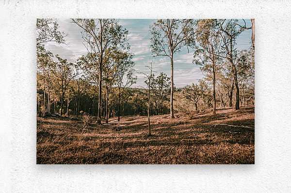 Late afternoon sunlight shadows a sparse woodland with trunks and shadows in beauty and rusticity. Mt Perry Queensland Australia