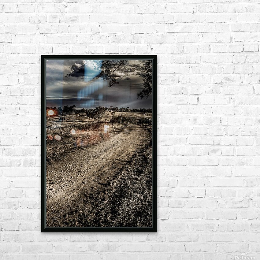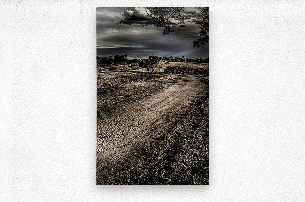 A stormy scene of dramatic intensity with winding dirt road traversing through the beauty of unspoilt lands. Mount Perry Queensland Australia