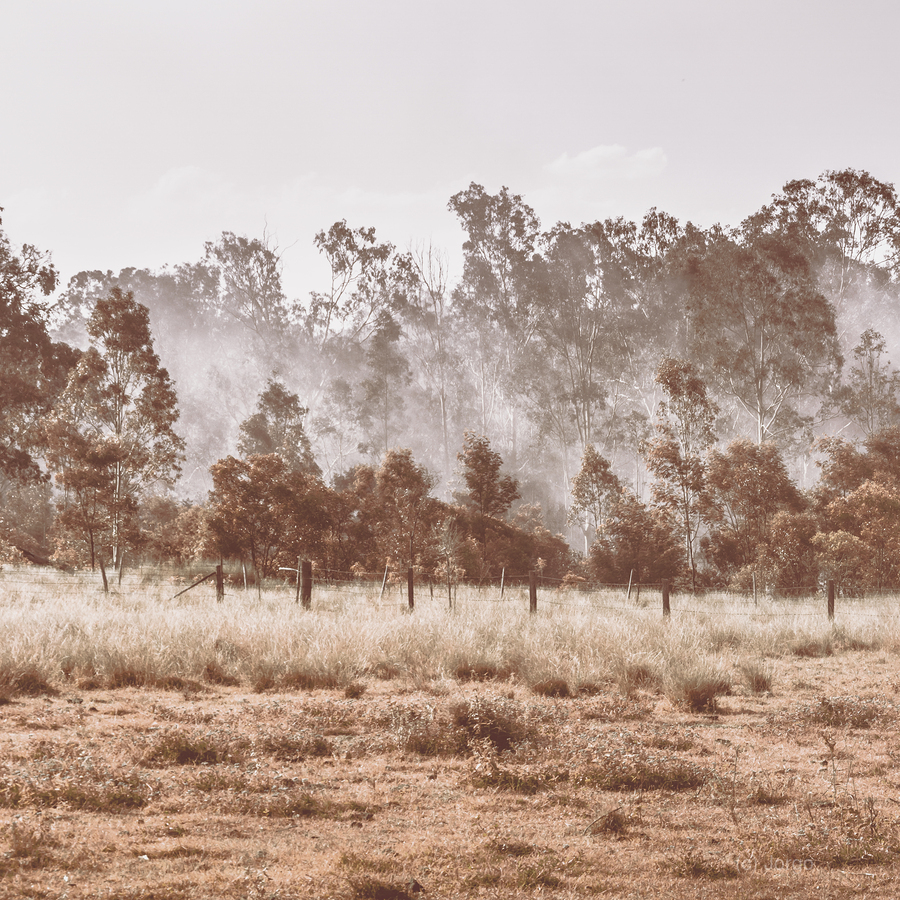 Beauty in the haze as a summer burnoff shrouds a serene farmland with poetic pacifistic ponderance. Black Horse Creek Rd Branch Creek Nour Nour National Park Queensland Australia