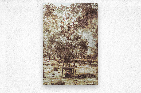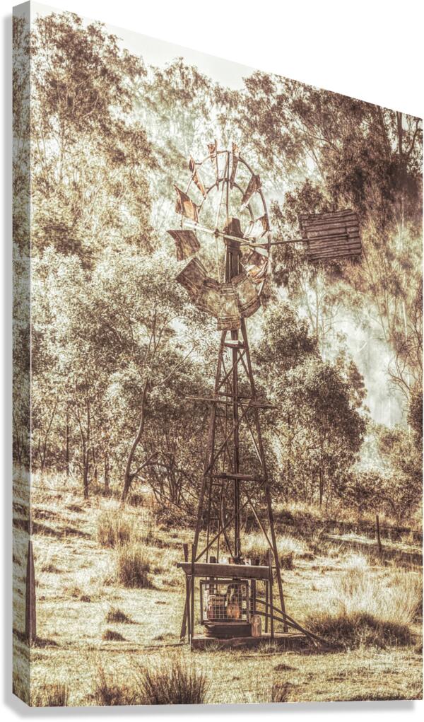 A piece of timeworn history with the focus on a forgotten farmstead windmill rotating before the smouldering of a country bush burn-off. Black Horse Creek Rd Branch Creek Nour Nour National Park Queensland Australia