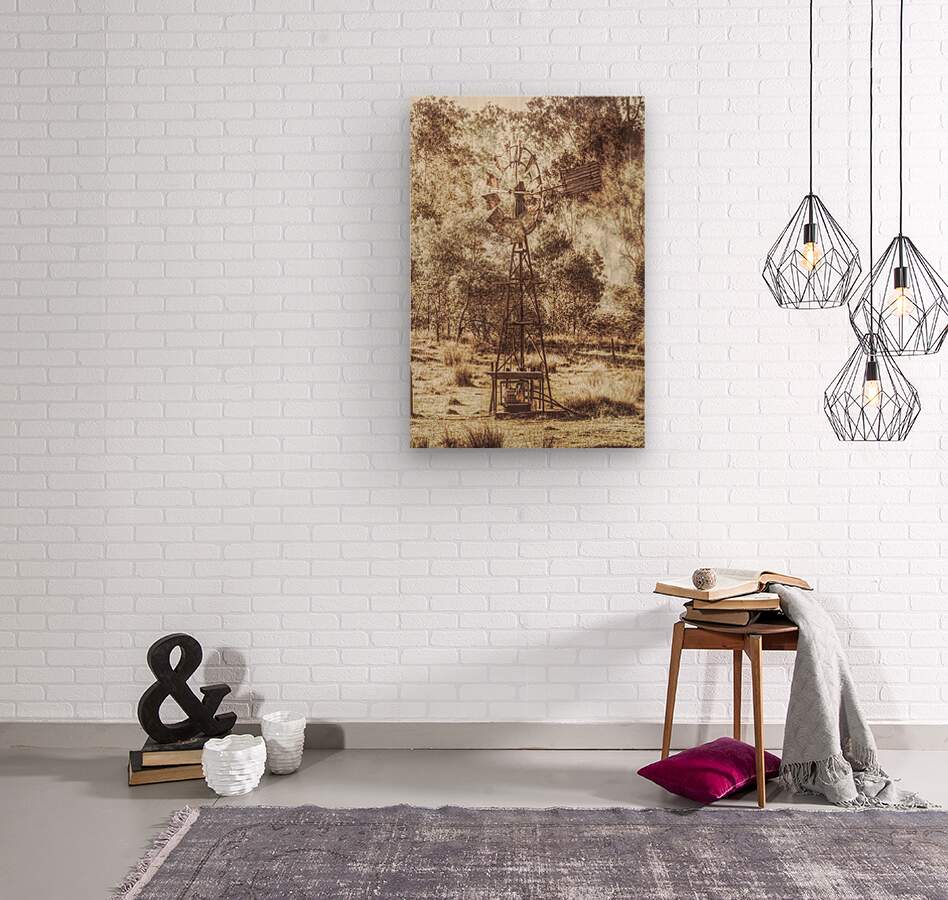 A piece of timeworn history with the focus on a forgotten farmstead windmill rotating before the smouldering of a country bush burn-off. Black Horse Creek Rd Branch Creek Nour Nour National Park Queensland Australia