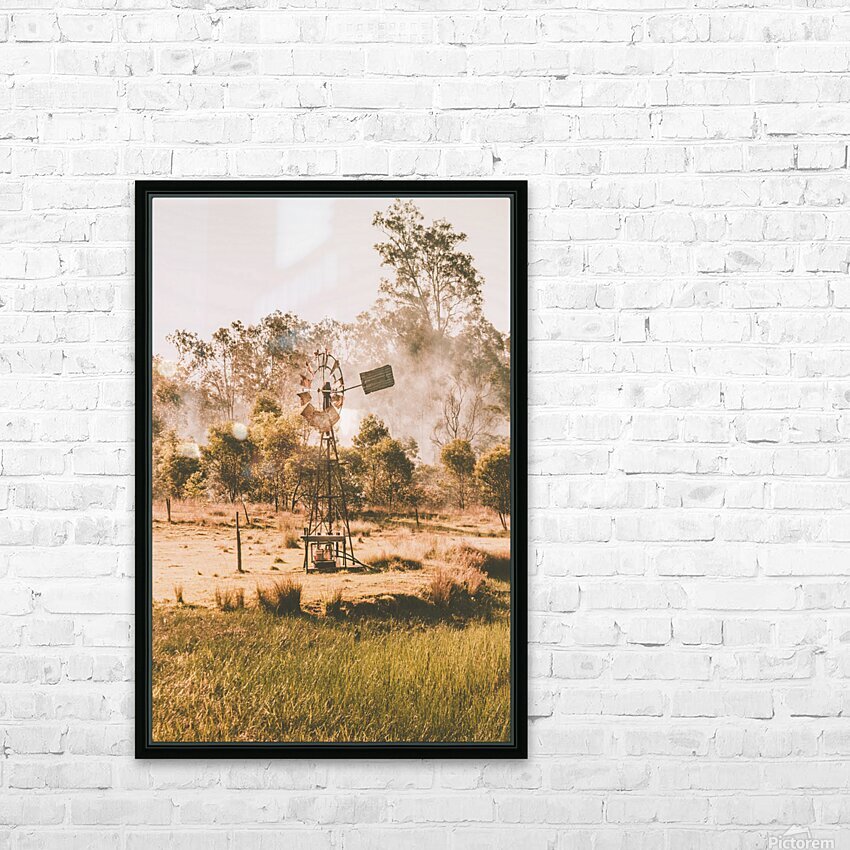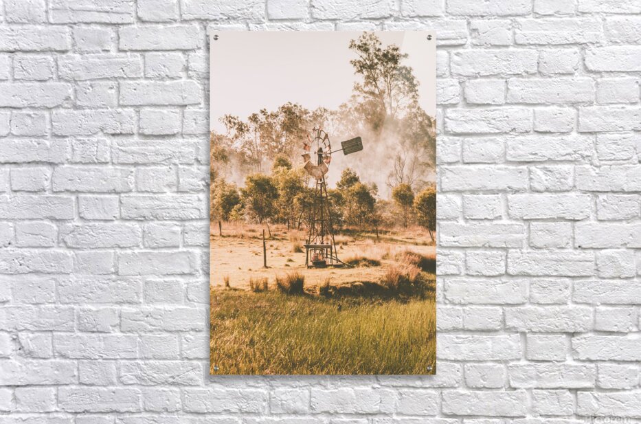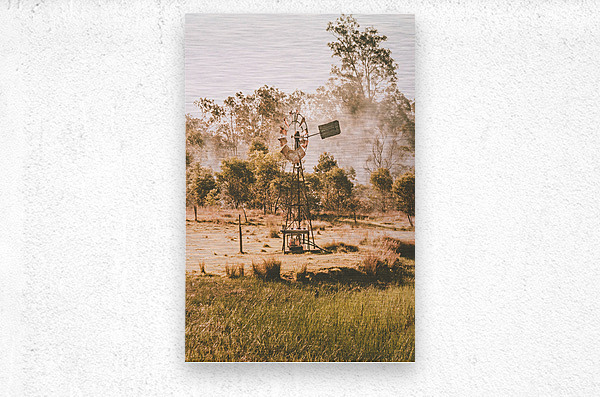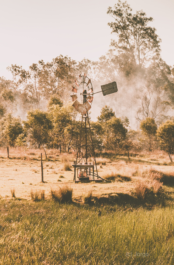 A landscape in farming tradition with industrial stylised windmill spinning before the smoke of a summer farm burnoff. Black Horse Creek Rd Branch Cre...[+]