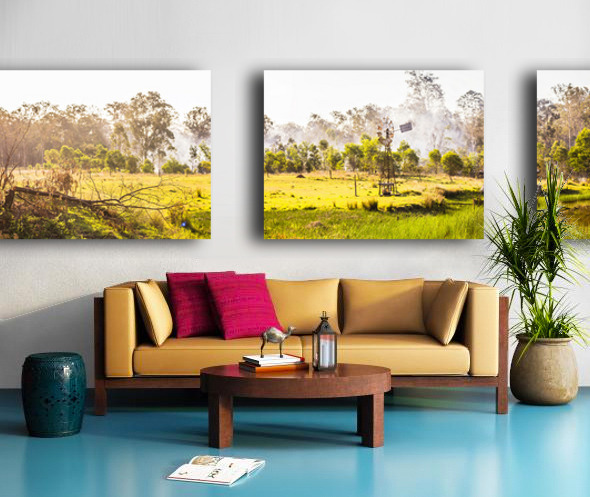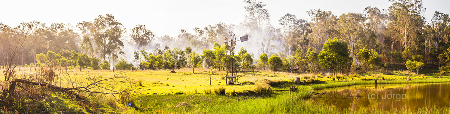 Windswept panorama farming scene of windmills and smoke of creeks and colour of beauty and summer dreaming. Black Horse Creek Rd Branch Creek Nour No...[+]