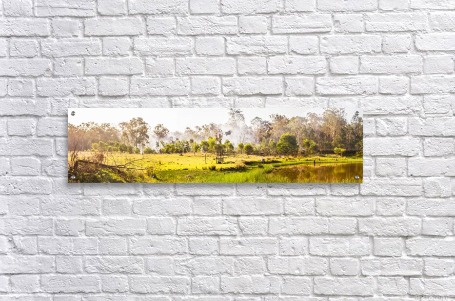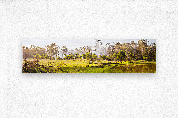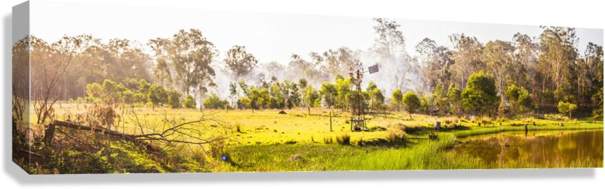 Windswept panorama farming scene of windmills and smoke of creeks and colour of beauty and summer dreaming. Black Horse Creek Rd Branch Creek Nour Nour National Park Queensland Australia