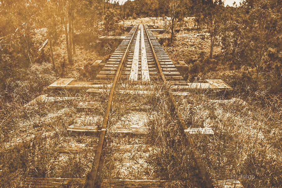 Horizontal photo of vintage industrial railway tracks crossing over a heritage bridge. Ideraway Rail Crossing Queensland Australia