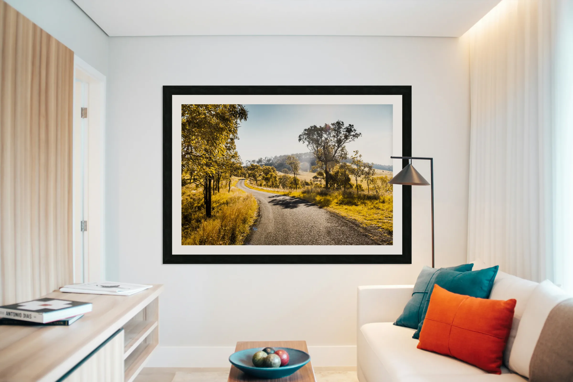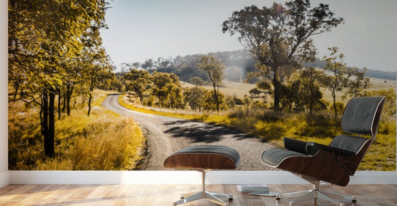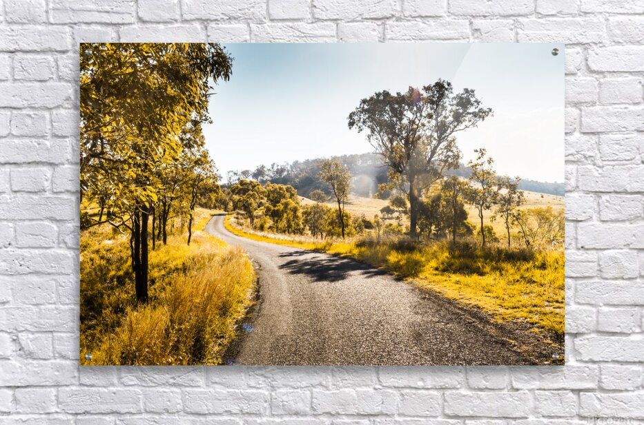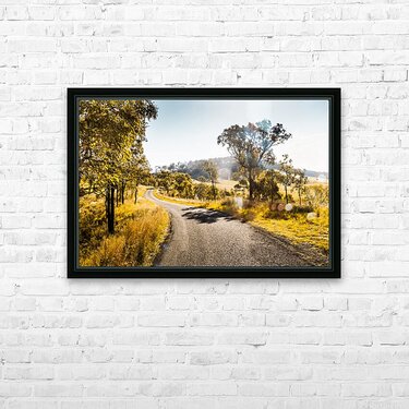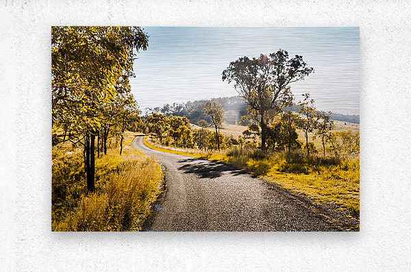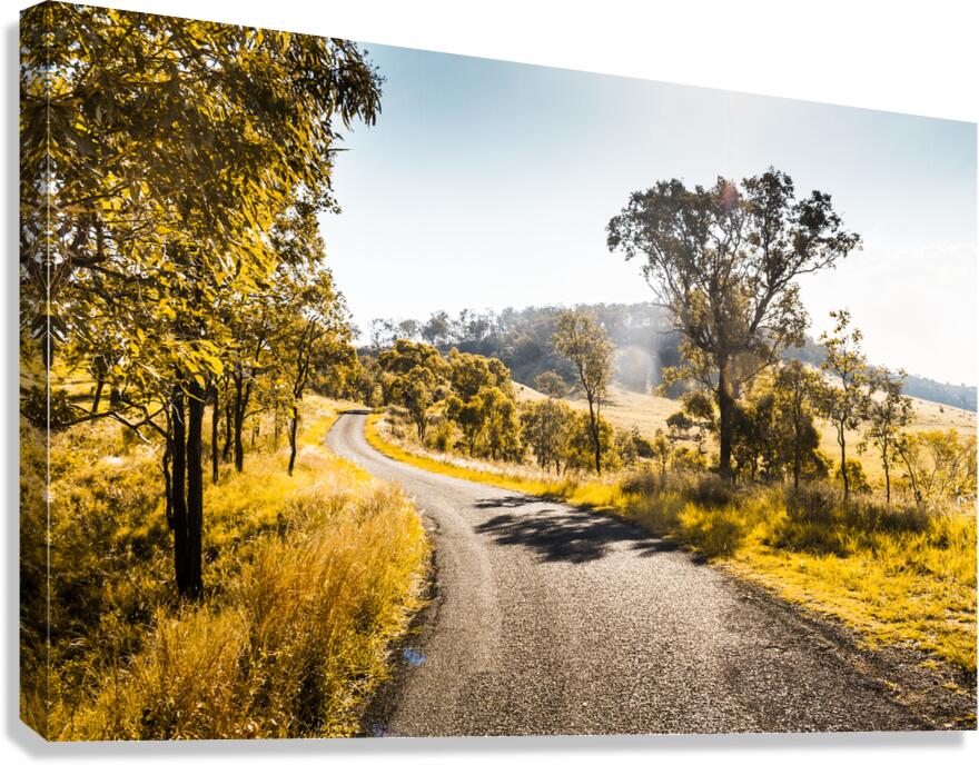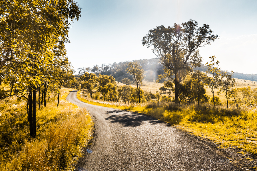 In glows of summer gold a back-country road winds and weaves through beautiful rural bushland in Branch Creek Queensland Australia