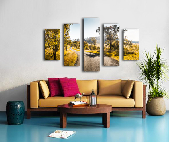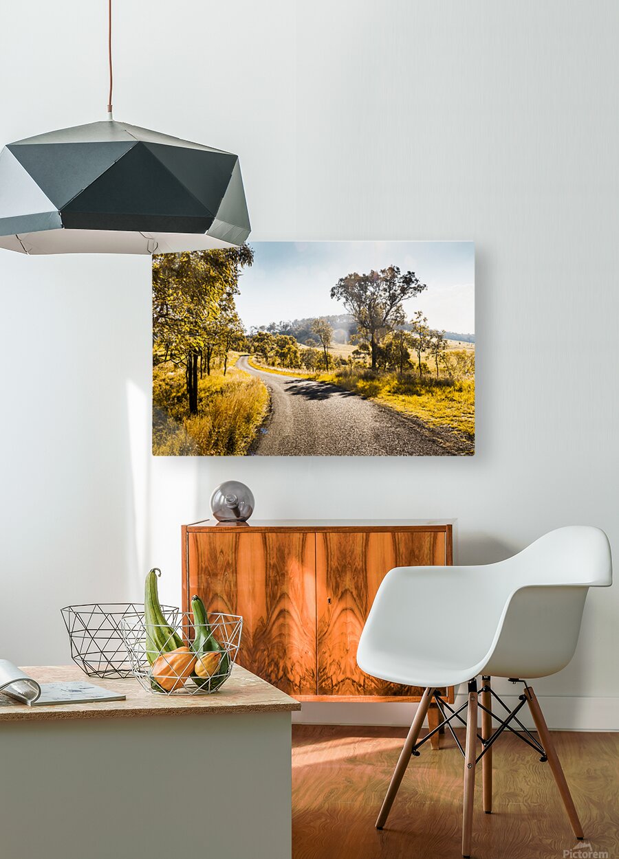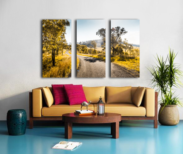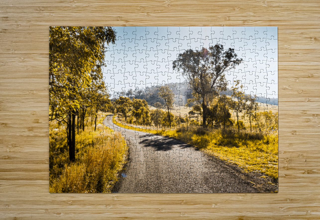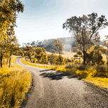 In glows of summer gold a back-country road winds and weaves through beautiful rural bushland in Branch Creek Queensland Australia