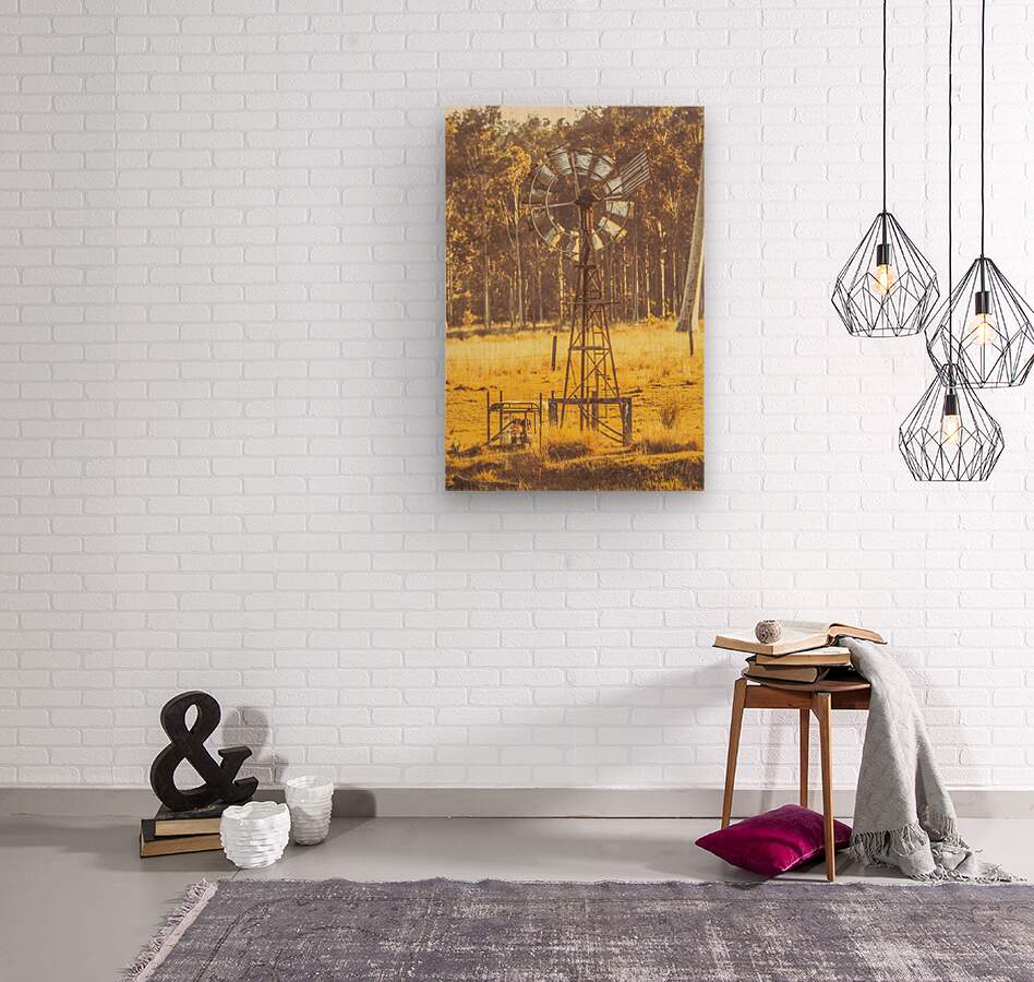 A vintage styled industrial windmill sits beside a lake among golden grass under the warm sunlight in the Australian outback. Black Horse Creek Rd Br...[+]