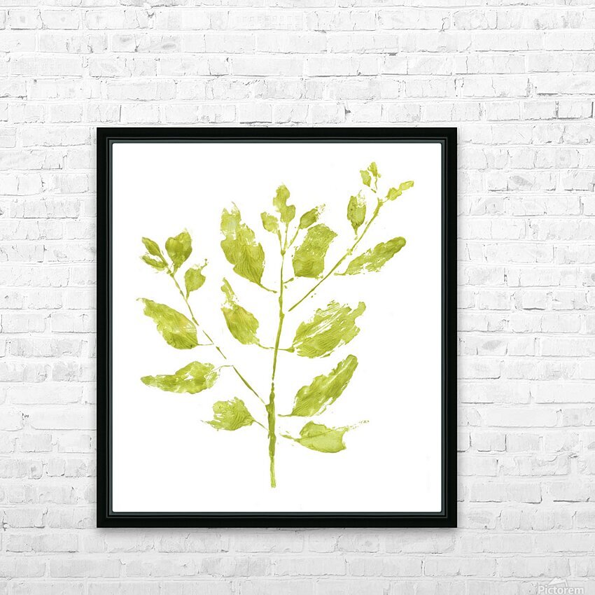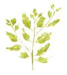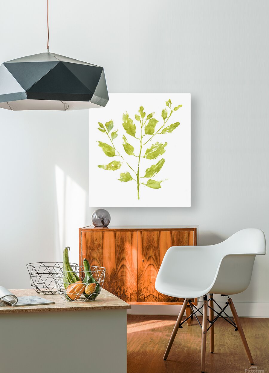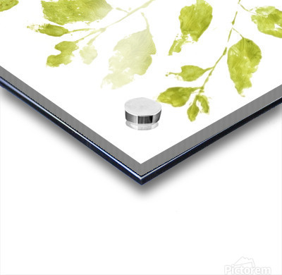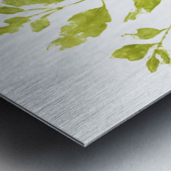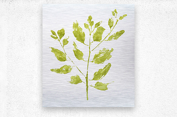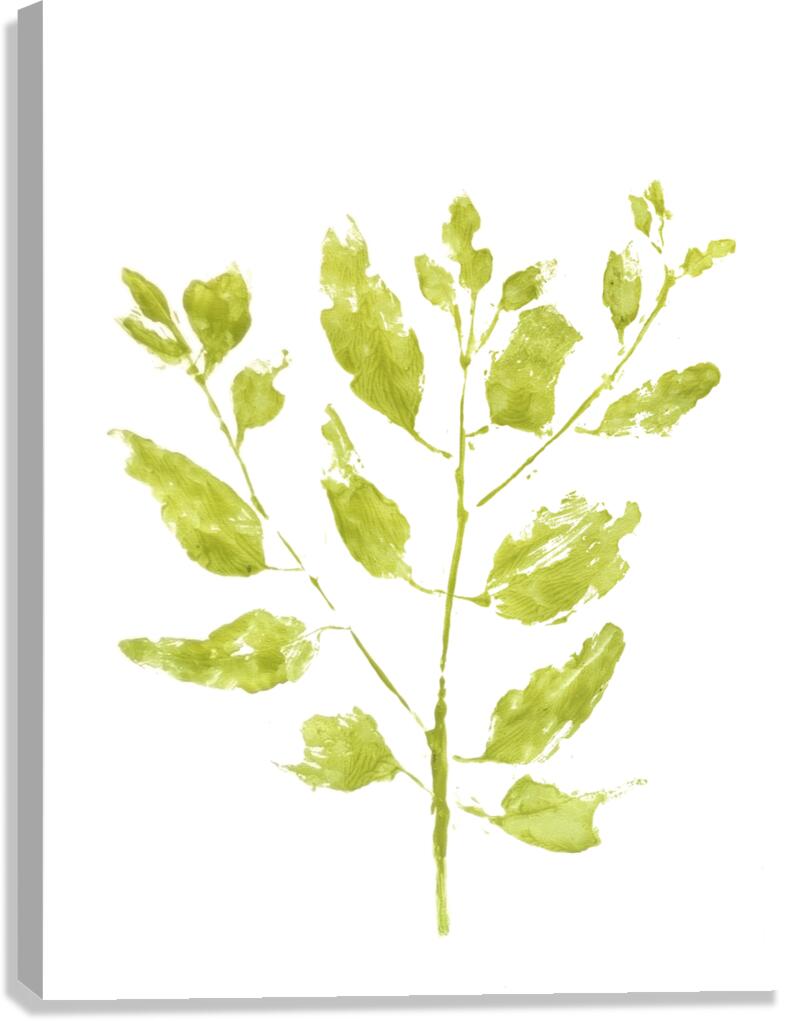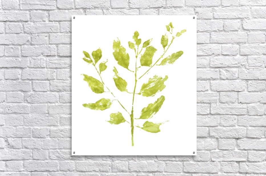 Acrylic painting of tropical growth with vibrant green leaves stretching out gracefully on white painted with soft gentle strokes in a display natures...[+]
