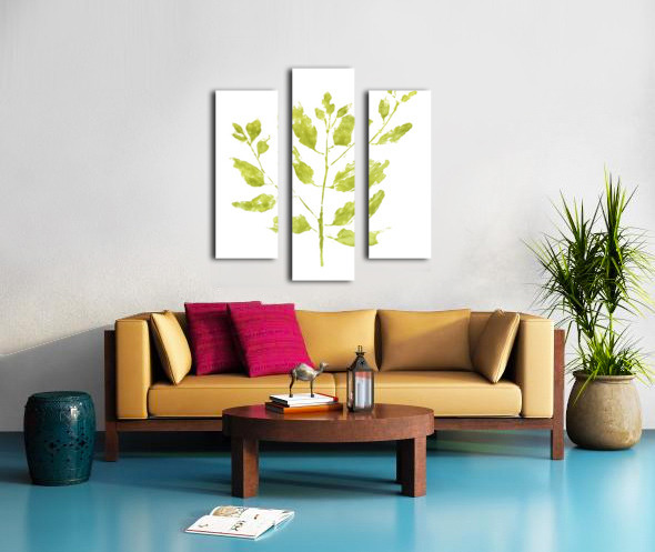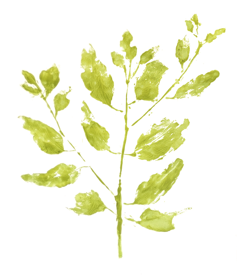 Acrylic painting of tropical growth with vibrant green leaves stretching out gracefully on white painted with soft gentle strokes in a display natures simplicity