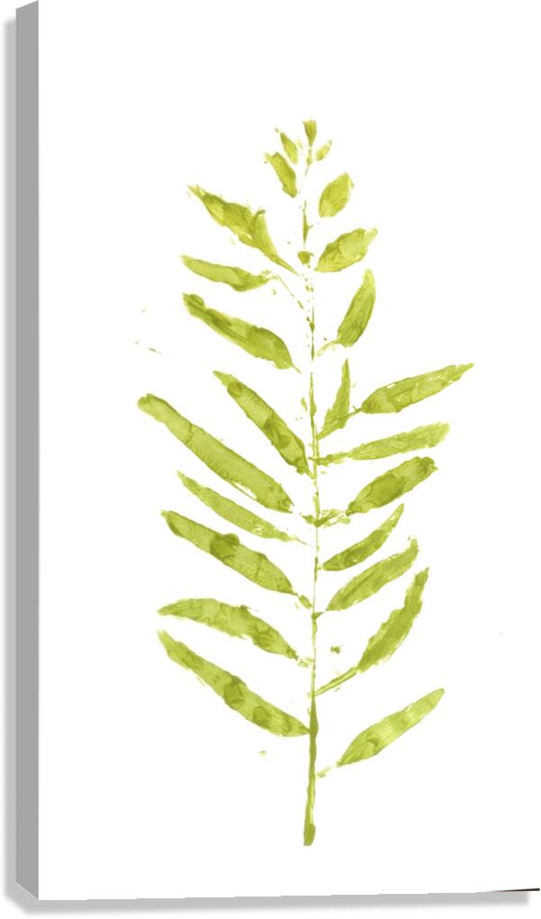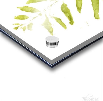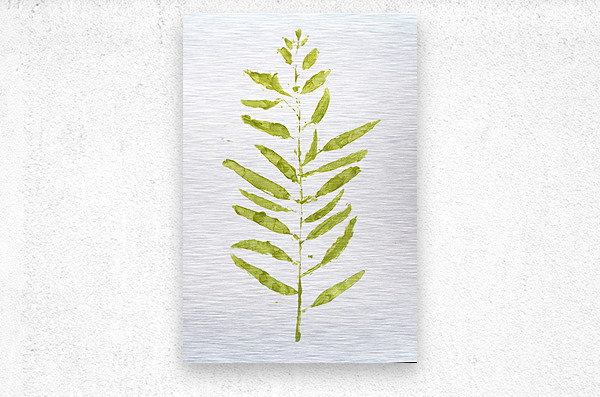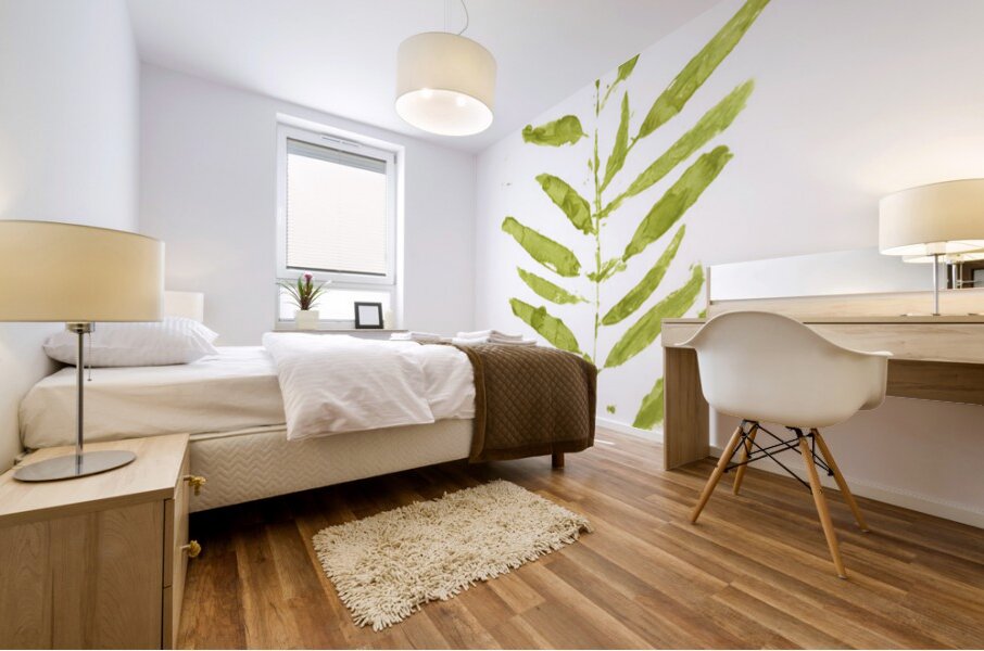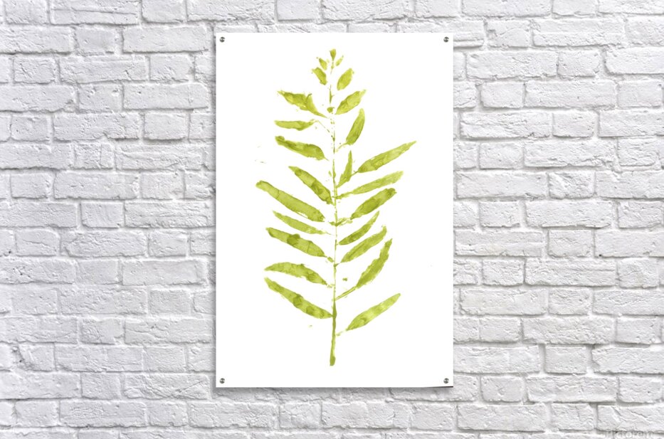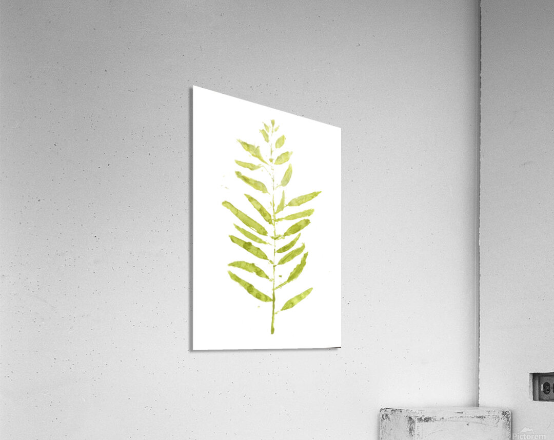 Fine art painting of a gum tree branch leafing out in a contemporary scene on contemporary white
