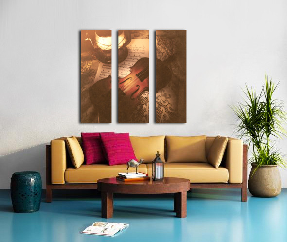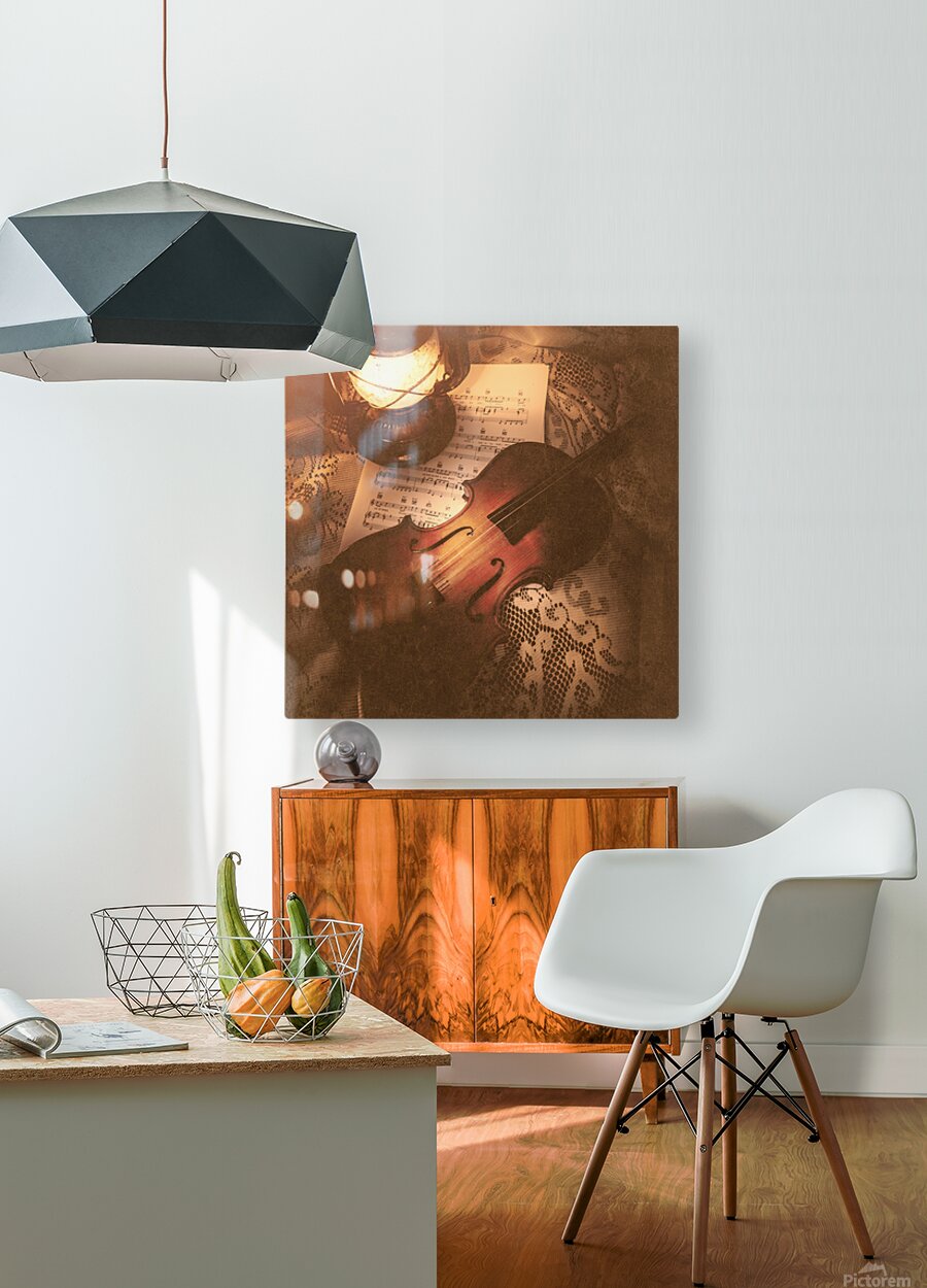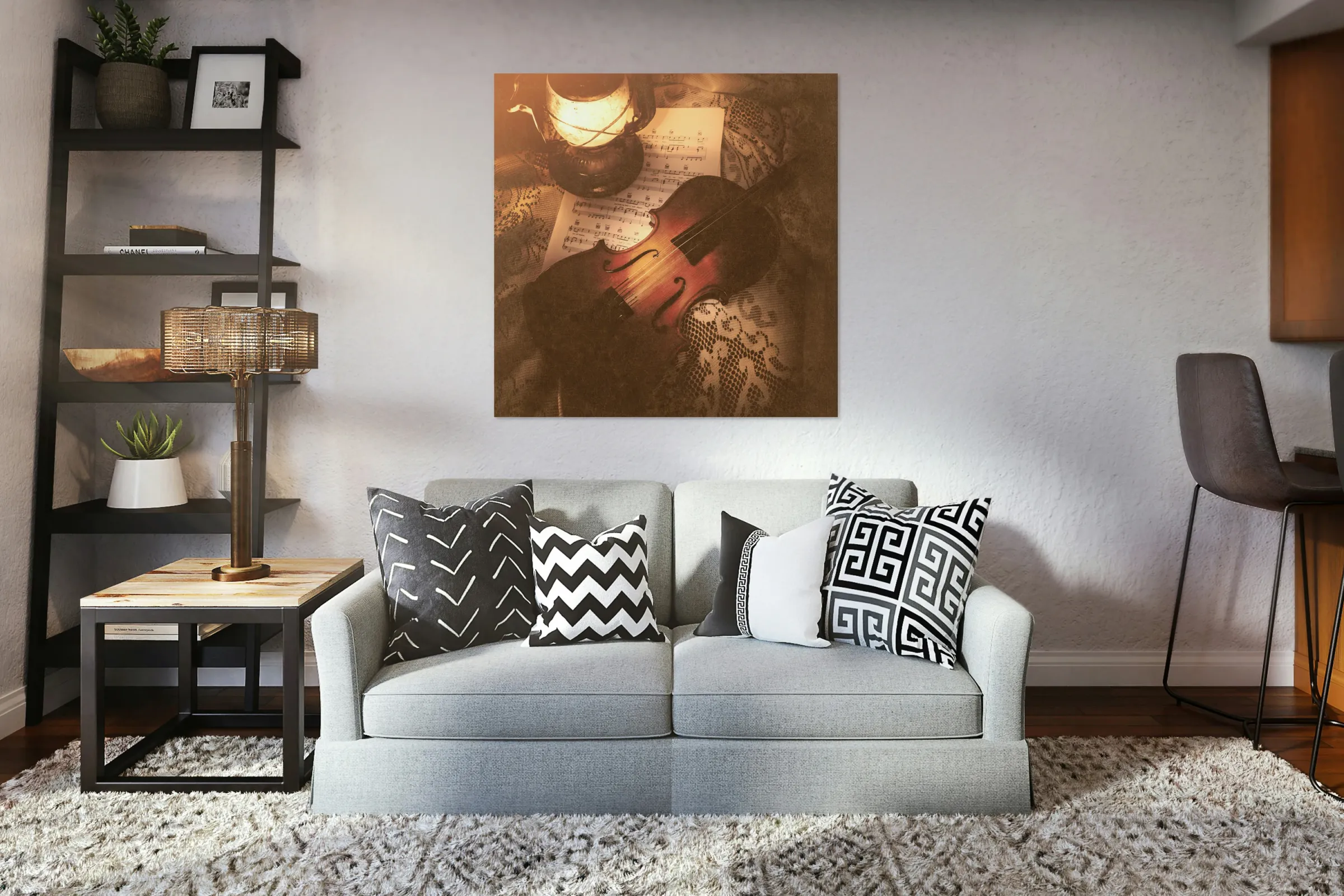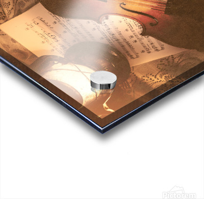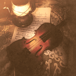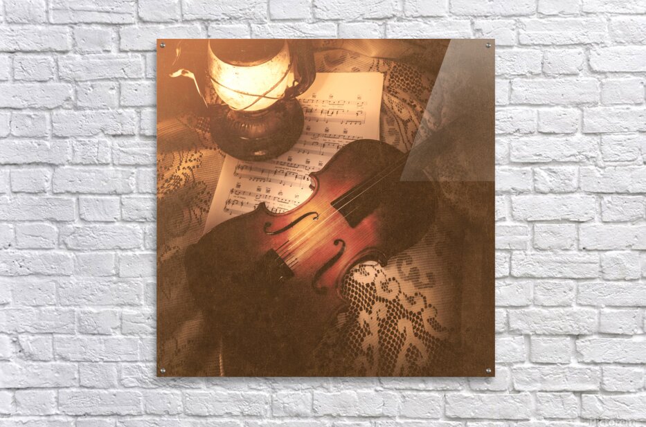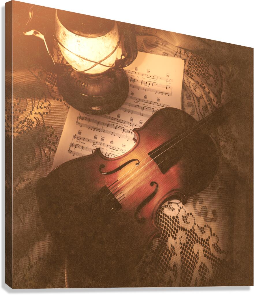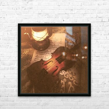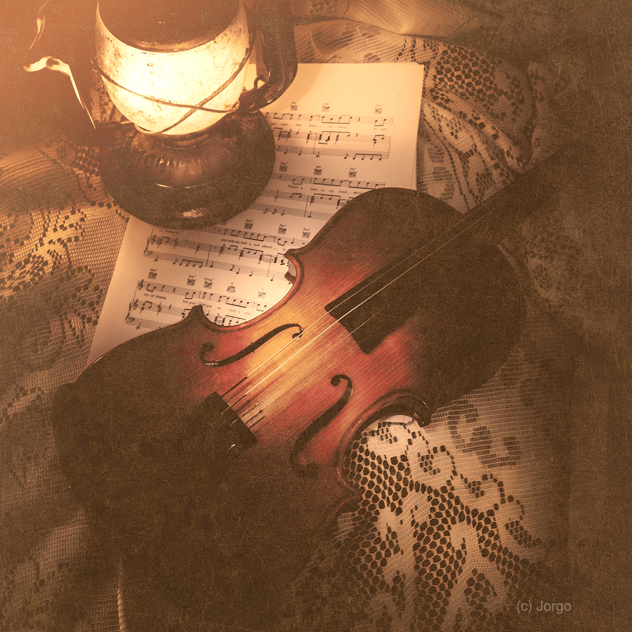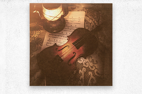 A rustic scene of a midnight Maestro with music manuscript old oil lamp and fiddle on the lace of luxury