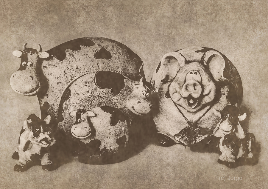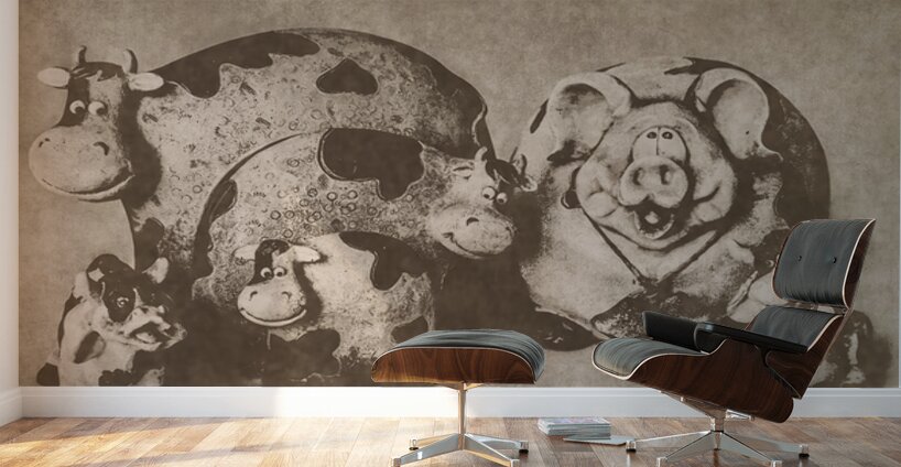 A vintage country scene of figurine goats pigs and cows playing the farmyard in fun rural styling