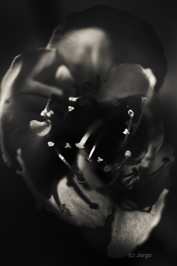 Macro flower photography on a bulb of a peach tree flower Prunus Persica captured elegantly with shadows of dramatics. Photographed: Mount Perry Queensland Australia