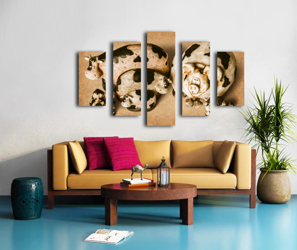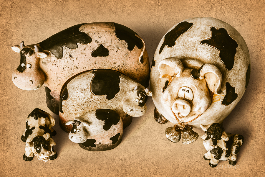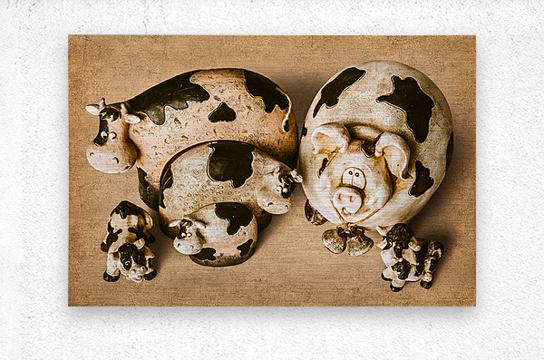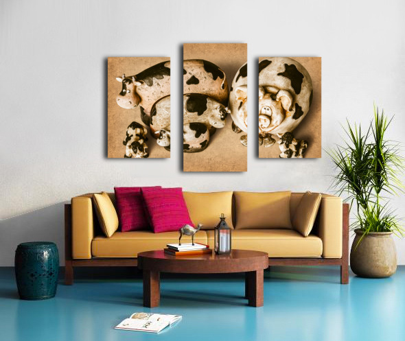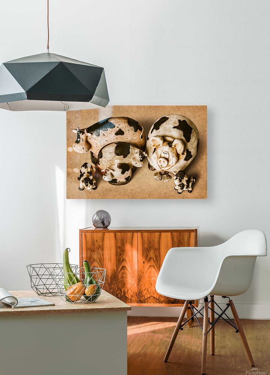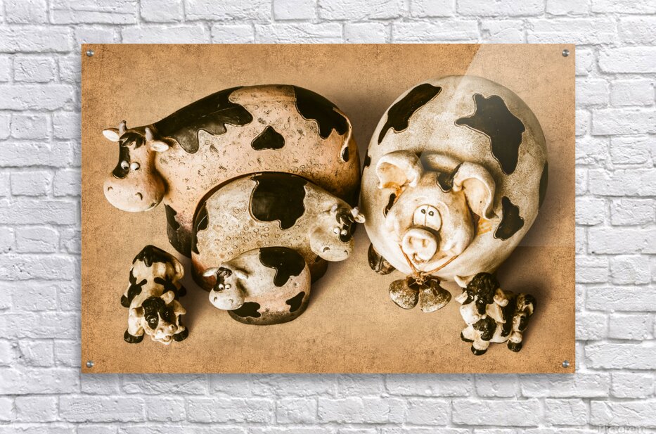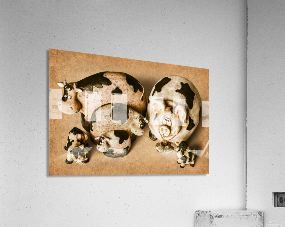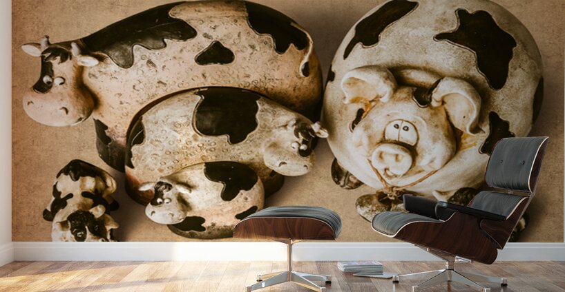 A cute and quirky barn of farmplay with miniature model cows, goats and pigs on beige background