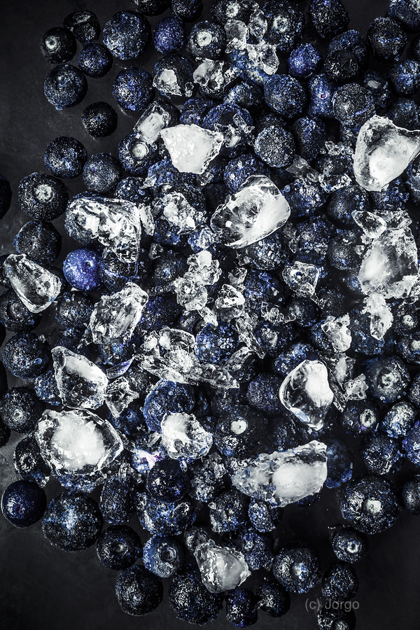 A cool blue display of frozen food delights with blueberries decorating a fresh frosty background of ice ornamentation