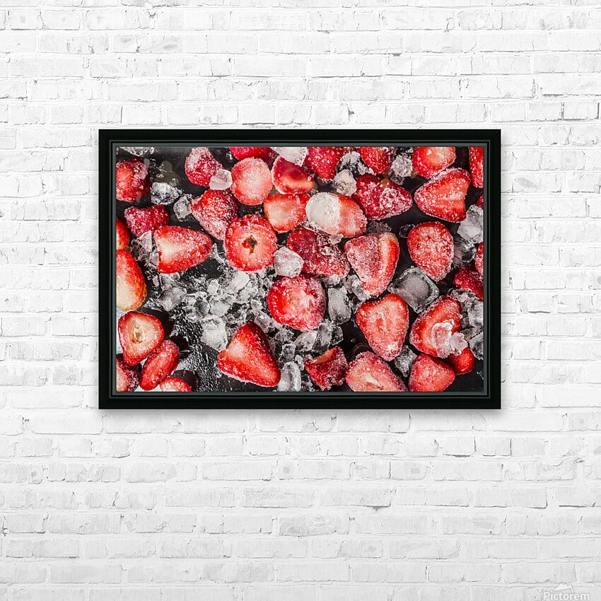 A frosty feast of frozen strawberries garnishing a black kitchen bench with shattered ice