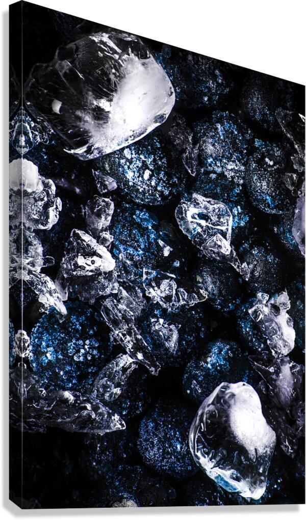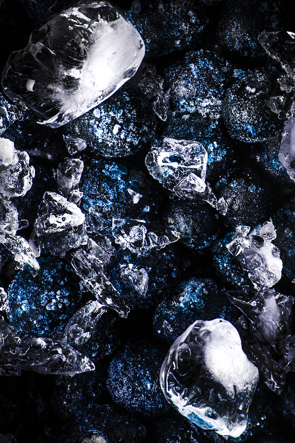 Artistic abstract of drinks in detail with blueberry garnishes and crushed ice on moody dark background