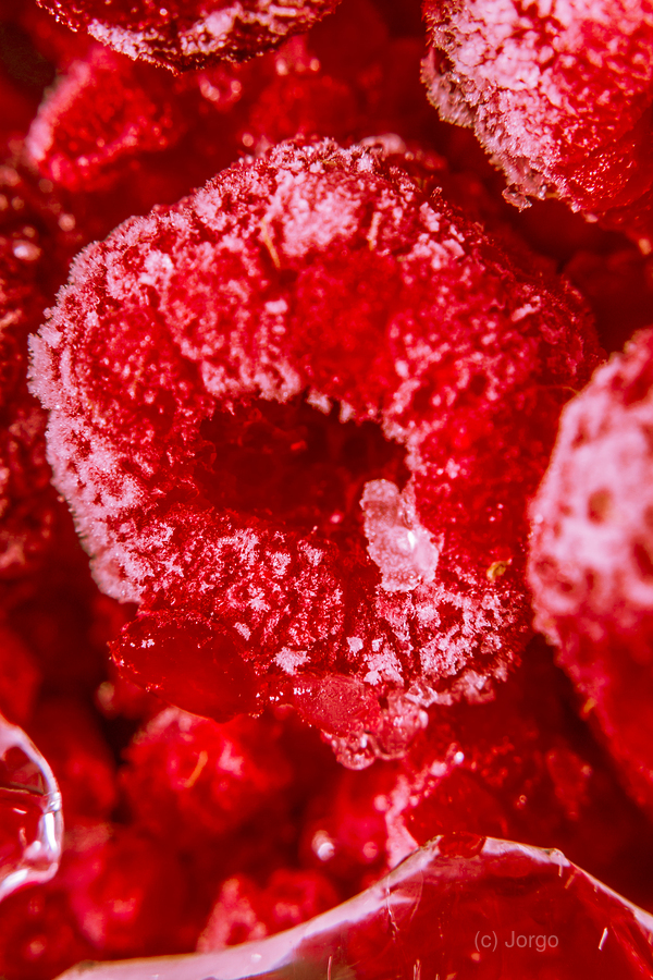 Close-up photograph of vibrant frozen raspberries in low DOF detail showing their icy texture and deep red hue