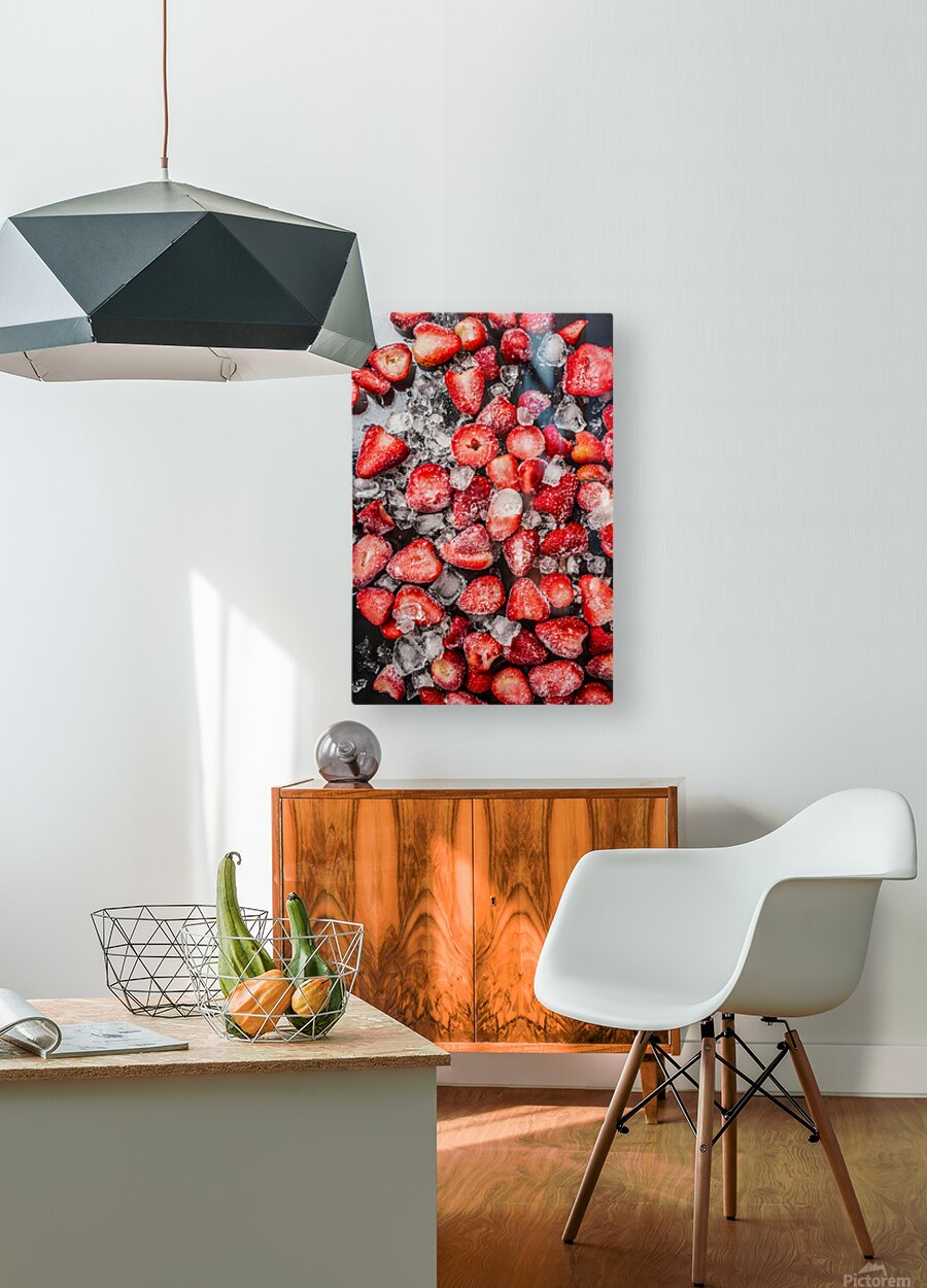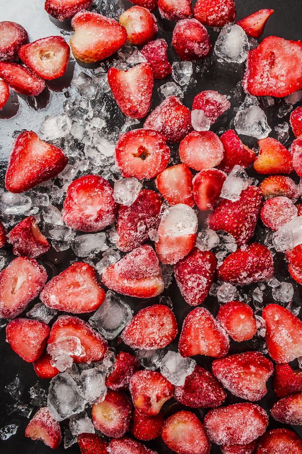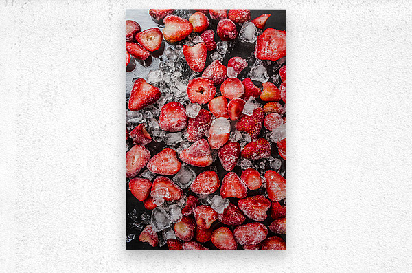 Vertical photography on a spread of icy cold strawberry snacks contrasted on a cocktail bar of black deliciousness